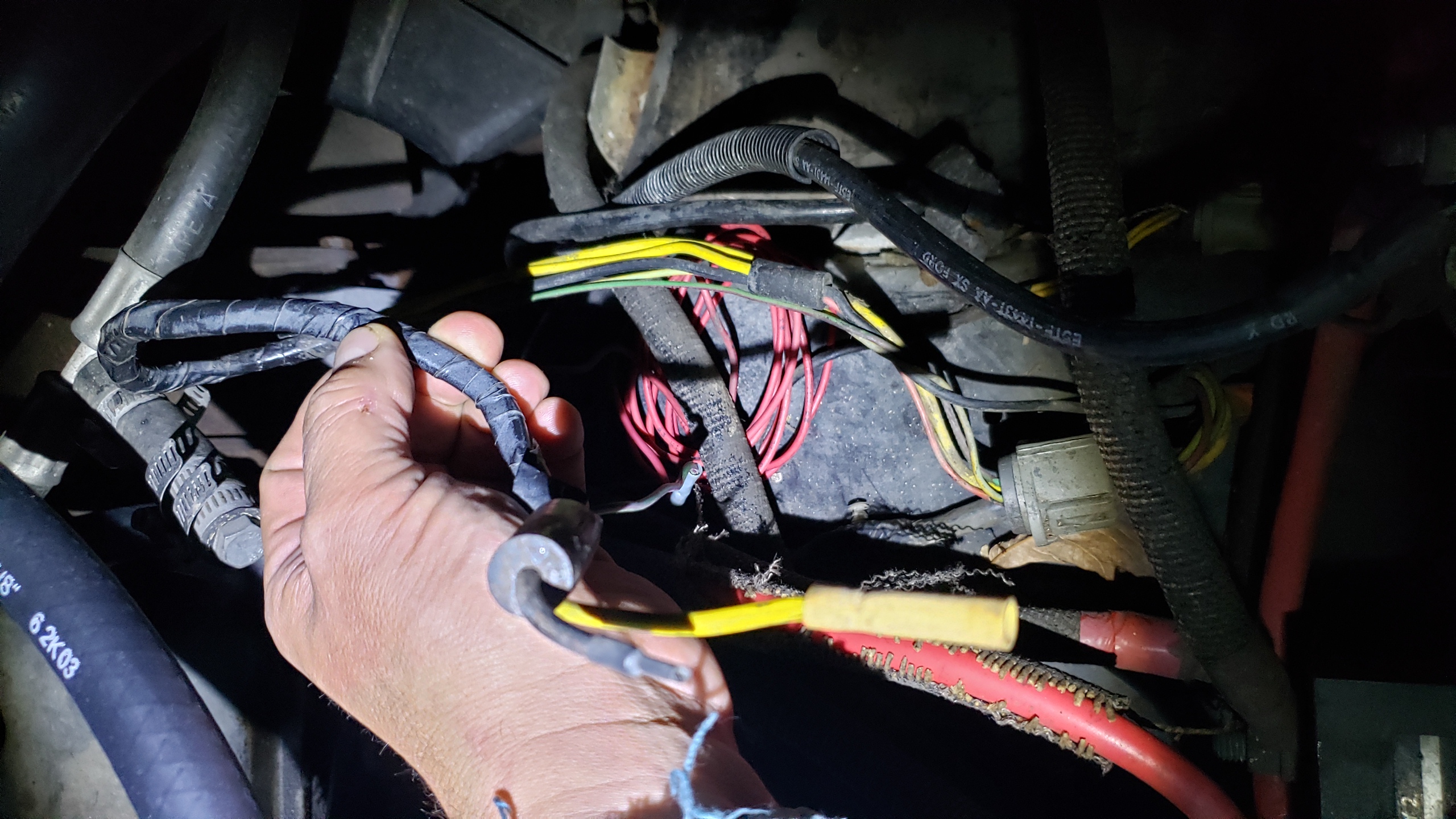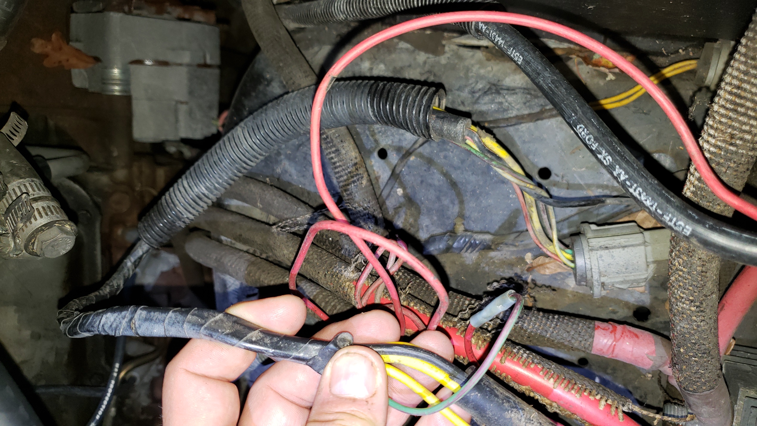 I parked truck on the back 40 a while back. Fiddled with soggy door pillar pockets, mouse trapping and heater core.  Have been snipping out ambulance lighting, typically very different than Ford. Black tape and horrid butt connectors... Are the cruise control wires hacked into the harness? seems so. The wires that used to connect to the mega alternator ( hinted at previously) are found severed. Pic attached.  Can i ditch that whole connector? Alternator now goes right into the battery selector switch. Can see new cables coming soon. Where does dash power come from? How to identify main feed? Next bit might be to remove the console between seats.. with all those relays and heavy cables. Lots of control stuff too, though mostly lights.... Carb is dripping, from the accelerator pump.... once i get it pulled up to the garage, from the back 40! Side note: Looking at used F150 STX SCab, 2.7L ... might pull trigger tomorrow night.  Can't move much in an RSX! 2018 has electrically controlled waste gates and some other things. Good times. On Sun, Oct 25, 2020, 1:27 PM ArdWrknTrk [via Bullnose Enthusiasts Forum] <[hidden email]> wrote: Good work on getting the heater core back in. Â