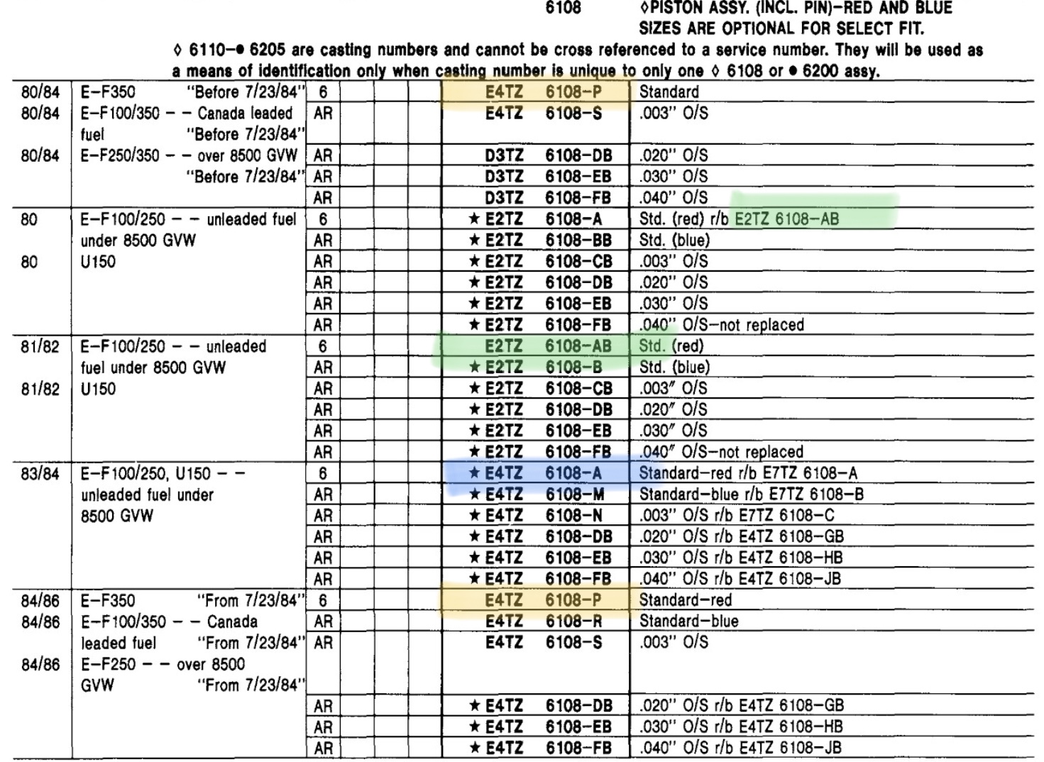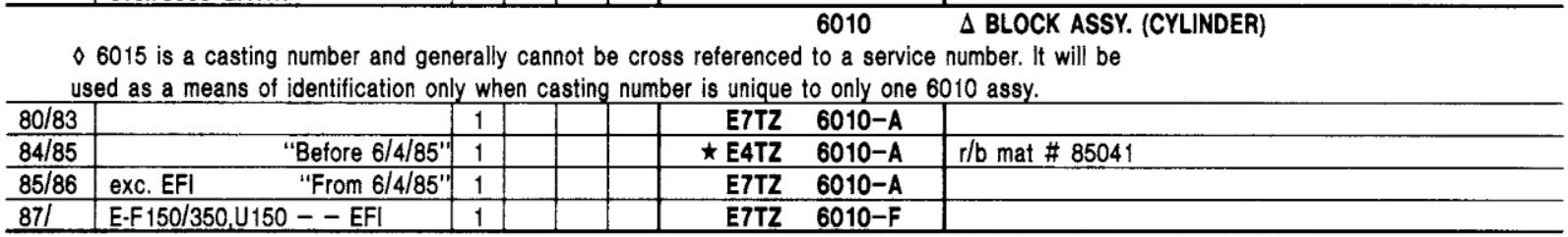 1980 on: D3TZ 6108-A for HD US trucks (E-F 250/350 over 8500) and all E-F100/350 Canada w/leaded fuel1980/81 before 12/8/80: D7TZ 6108-A for LD trucks (E-F100/250 & U150 under 8500 w/unleaded fuel)1981 from 12/8/80: E1TZ 6108-A for LD trucks (E-F100/250 & U150 under 8500 w/unleaded fuel)