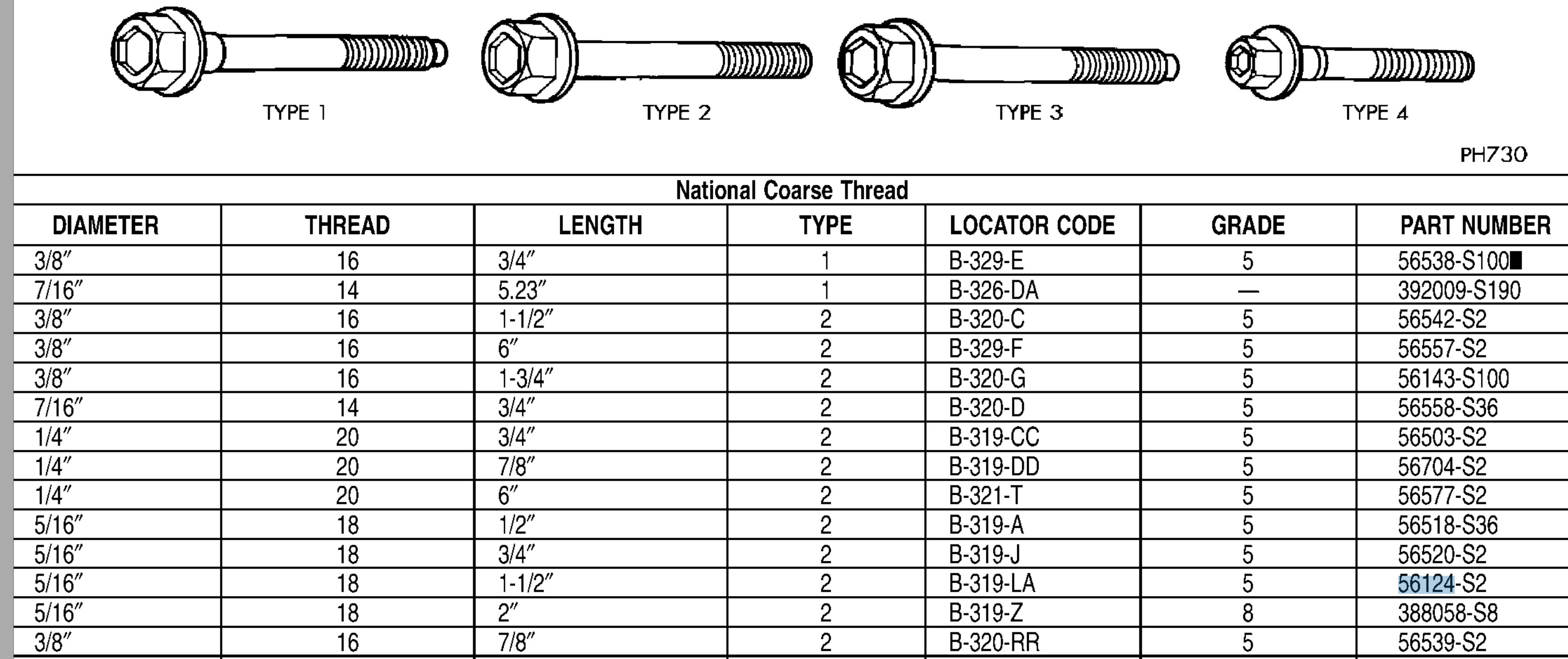 383765-S Bolt - Hex Hd. 5/16-18x3.625. Another is 56124 and here's what it shows - a Type 2 head: