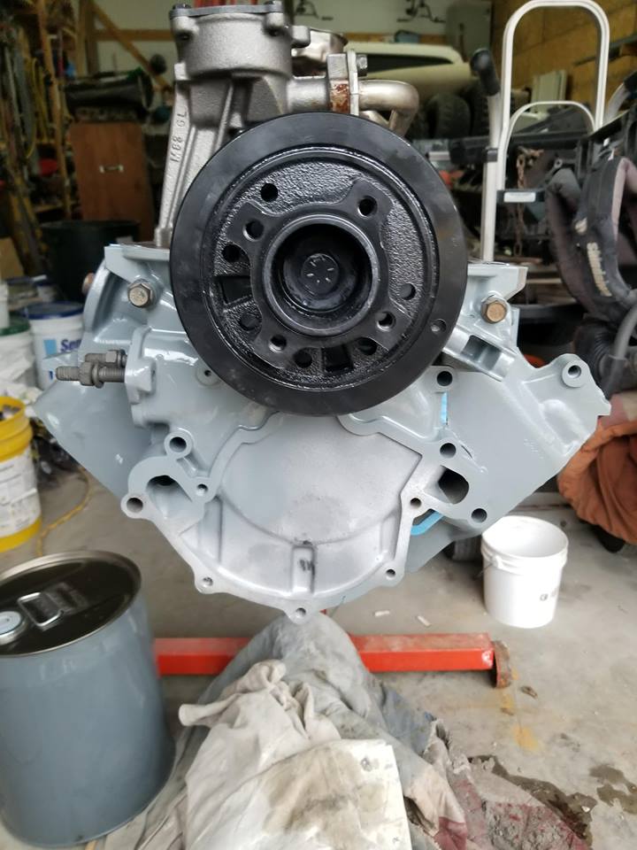 I picked up the two oil sump tubes that I dropped off at the machine shop to be put in the hot tank. I installed one put the other in a bag on the shelf. I couldnt find the proper nut for the main cap so I just used a 3/8" grade 8 nut with a washer underneath it. I used some loctite on the threads of the main cap stud and the two bolts that go to the oil pump. Whenever I do this I also use some ARP torque lube under the head as well as on both sides of the washers so they dont bind up there during installation. ![]() One of the things I dont like about installing these front covers is how big the gaskets are. I always have to trim around them with a razor knife after the sealant has set up to keep it from looking "half ass". I will do that today some time. Directly after the front cover went on I installed the balancer. This is a Pioneer product and looks like a nice quality part. I painted the inside of the front main seal with some STP along with the outside seal surface of the balancer. I painted the inside with some nickel based anti seize. Of course I lubed the balancer bolt and washer with ARP torque lube before I took the torque wrench to it. Torqued it to 70 ftlbs and then to 90. ![]()