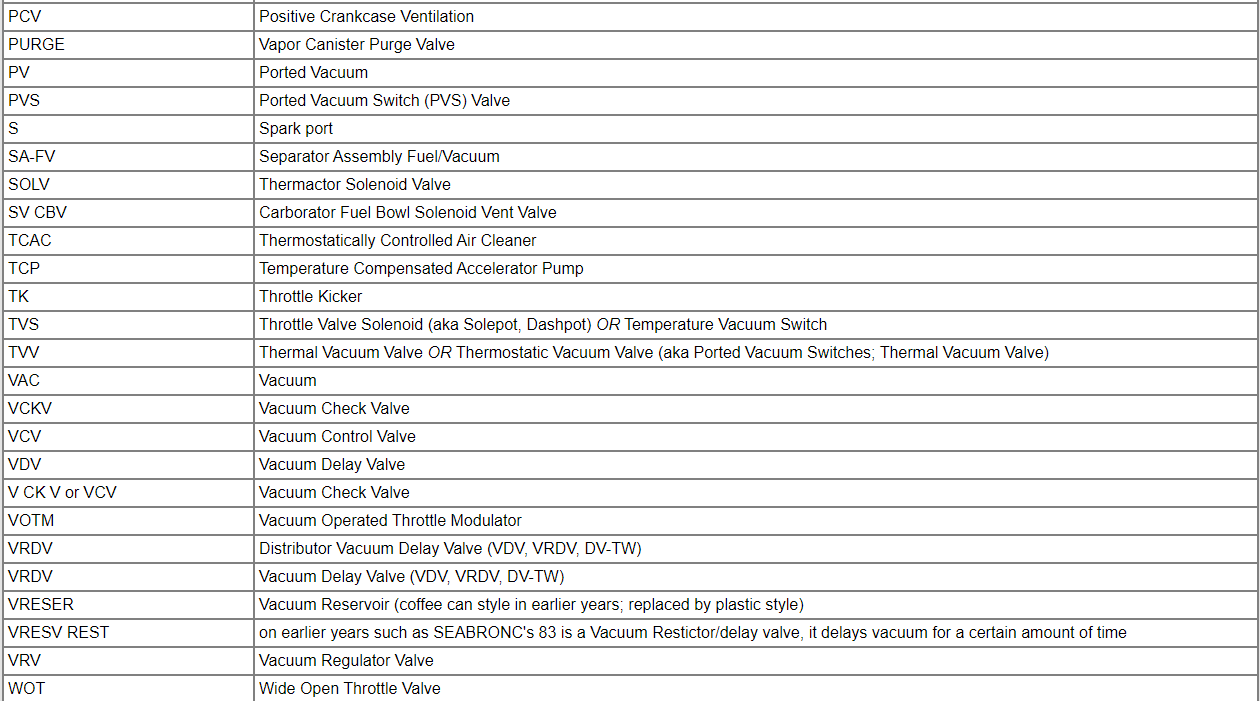 I do believe Gary has a list of all the vacuum acronyms we could gather. I know that back on FTE we put together a list that was stickied. While it might not have Engine Control Unit, Powertrain Control Module, Thick Film Transistor, Spark Out, Profile Ignition Pickup or Electronic Engine Control, it does have a bunch of the mystery vacuum initials like Thermal Vacuum Switch and Vacuum Control Valve.