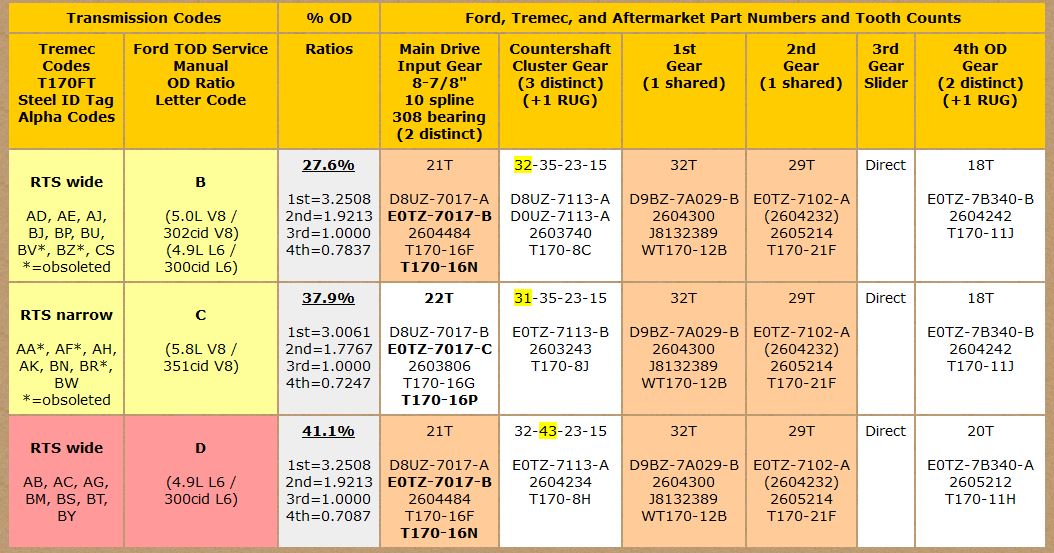 Please note that there or other types of T170 used in Fords that were referred to as RUG or SMOD or SROD. That is not what I have. I definitely have the TOD version (also known as RTS). The tag shows this to be an RTS AH model (37.9% OD ratio). I have attached another pic that shows the details (it's the middle row)