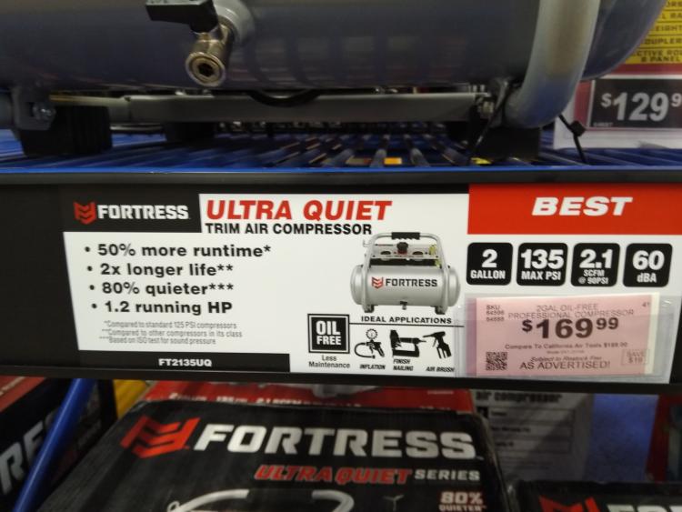 I see they have their single tank Fortress compressor on sale for ~$150. 😖 I hate that.99, whether at the gas pump or in this store of perpetual "SALE"s! Anyway, tank is 6"dia x 16"l. ![]() ![]() ![]() This is very similar to the California Air compressor, and available locally, with a generous return policy. 2.1 SCFM @90 IS 4.2 @ 45, and that's really all you need, to air up.