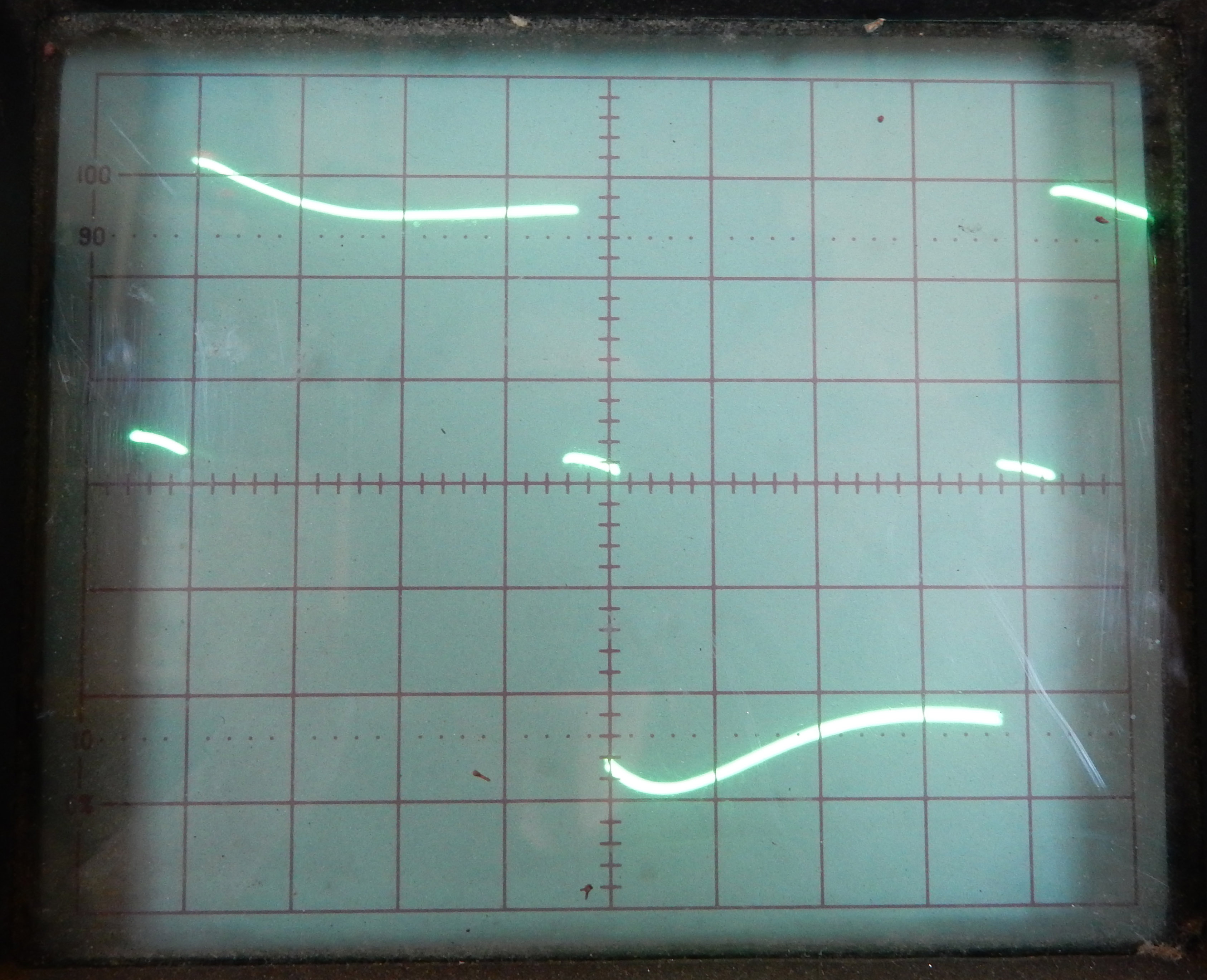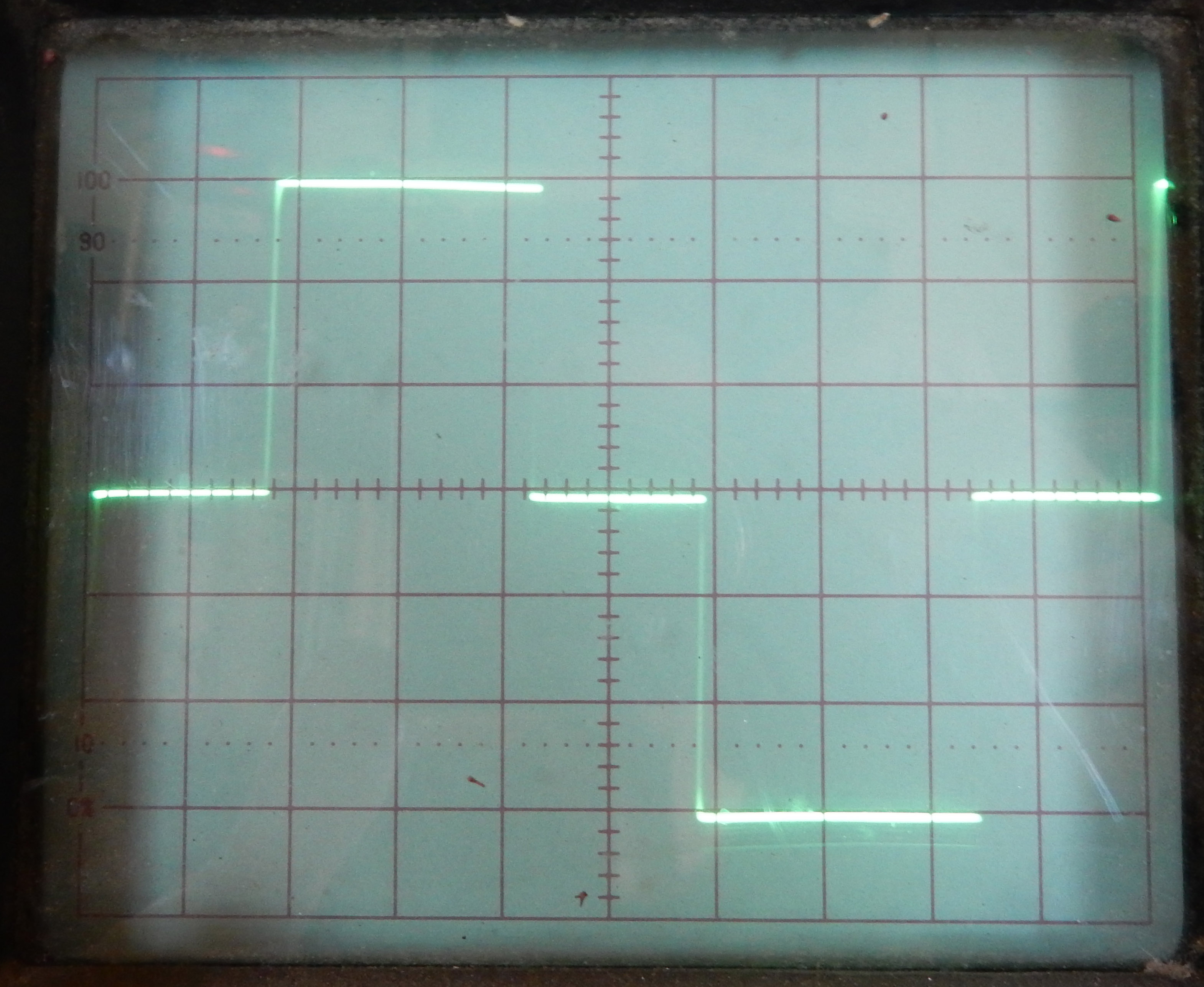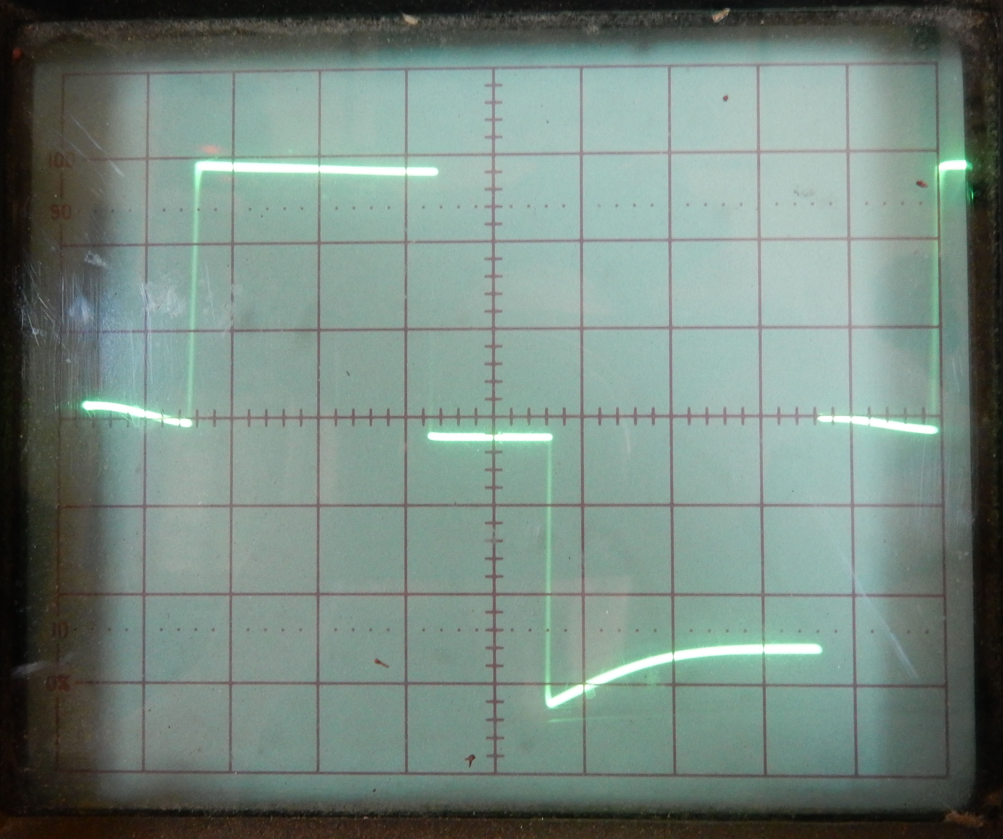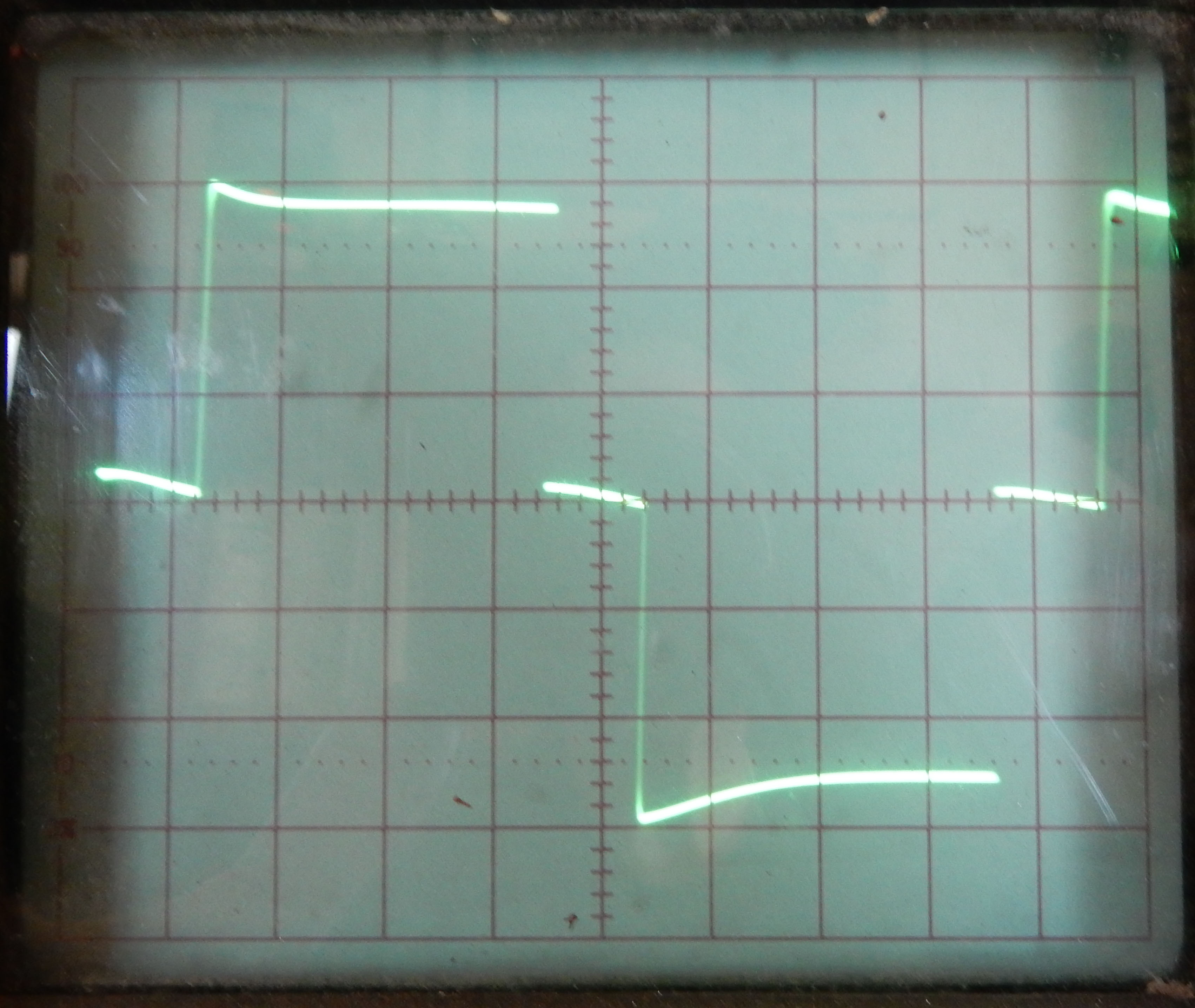 I took Jim's suggestion and put the 'scope as well as the DVM on the inverter today. The DVM shows 102 volts when there's no load on it and 122 volts with the compressor on it. But that's not too accurate as the DVM is expecting a sine wave, and as you'll see this one is a square wave.