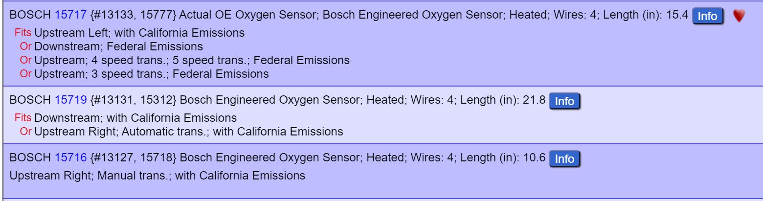 ![]() Anyway, I think I've almost gotten all of the connectors on the harnesses ID'd and hope to finish that up today. But, I want to confirm my understanding of the O2 sensors and their usage. There are 3 of them in the EEC-V system: #11 - upstream right; #21 - upstream left; and #12 - downstream/after the cat. My notes tell me that since I won't have a cat I can't run the one that is after it since it will always throw a code - and there's no reason for it anyway. Does anyone disagree? So, looking at the Rock Auto site I find these three Bosch sensors. And since I know that only the CA-spec 460's had EEC-V/MAF/SEFI then I think I need #15717 (upstream left w/CA emissions) and #15716 (upstream right w/manual trans and CA emissions). Disagree?