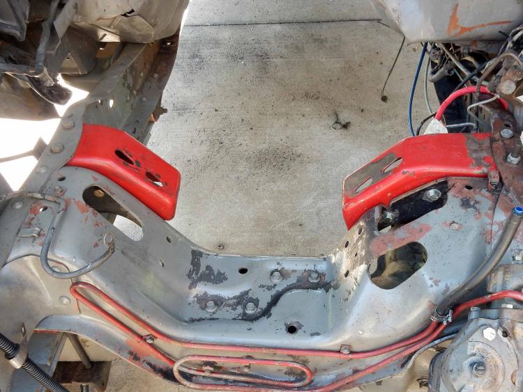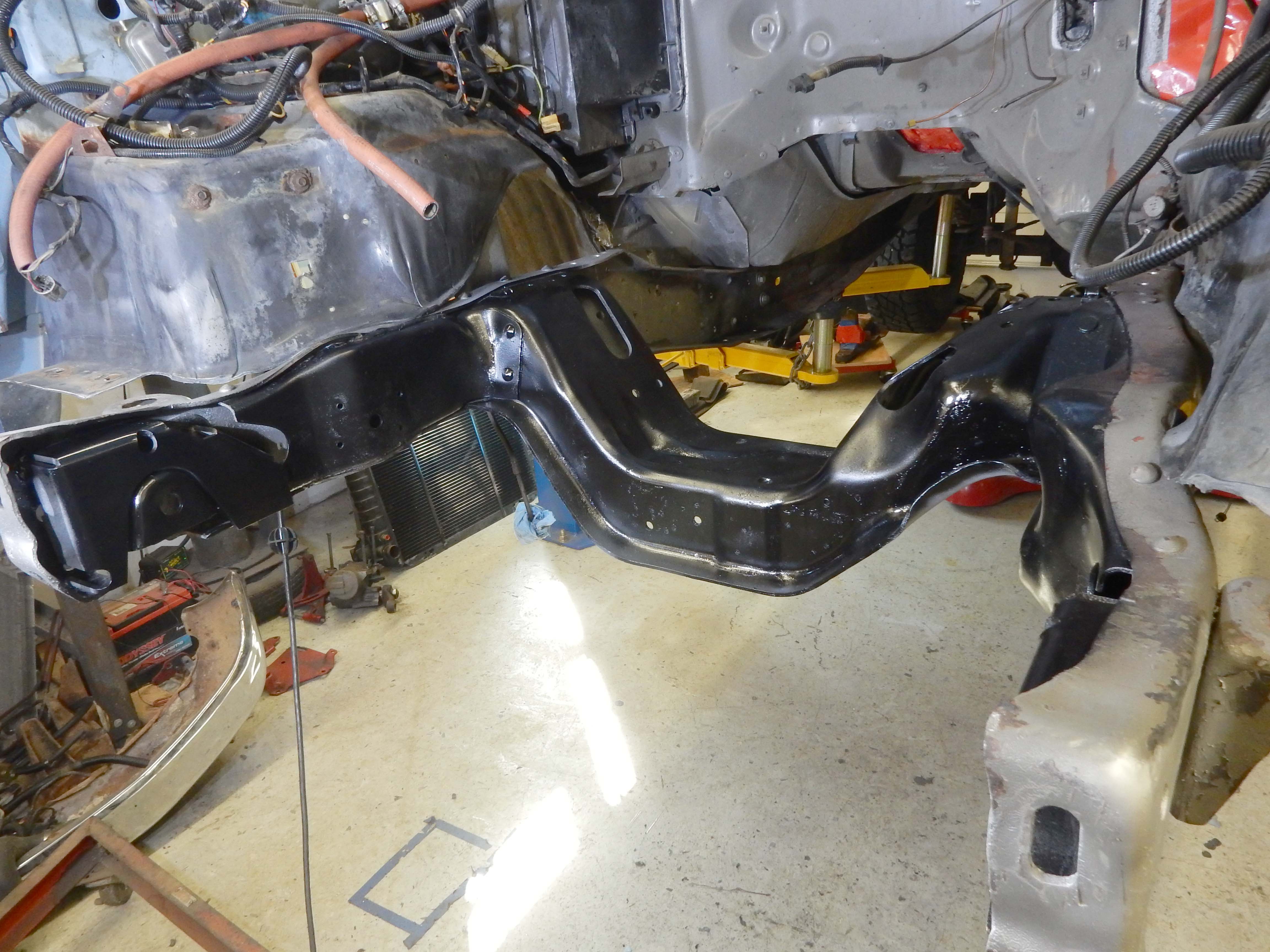 Got the engine crossmember and frame horns cleaned up, primed, and painted today. Oh, and I got the areas where the rear spring hangers bolt on painted as well since they'd been banged up a bit in getting the old hangers off. Plus there were bare holes in the frame.