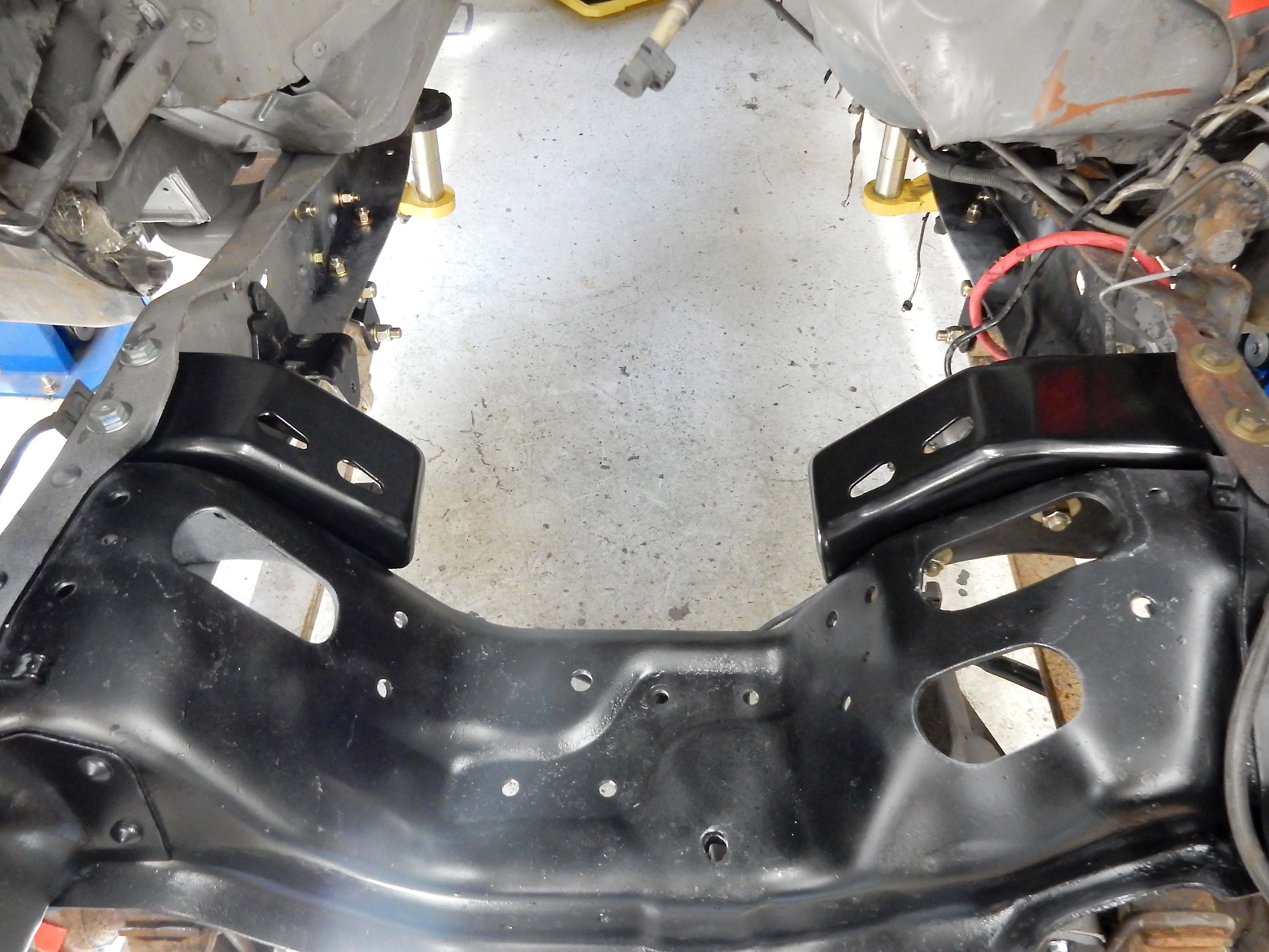 Here they are from below. Think the driver's side one has enough fasteners? When I got the truck the driver's side only had two fasteners to the crossmember, and they weren't tight. And the ones to the frame were wonky. And they were small. All are being upgraded to 1/2" G8.