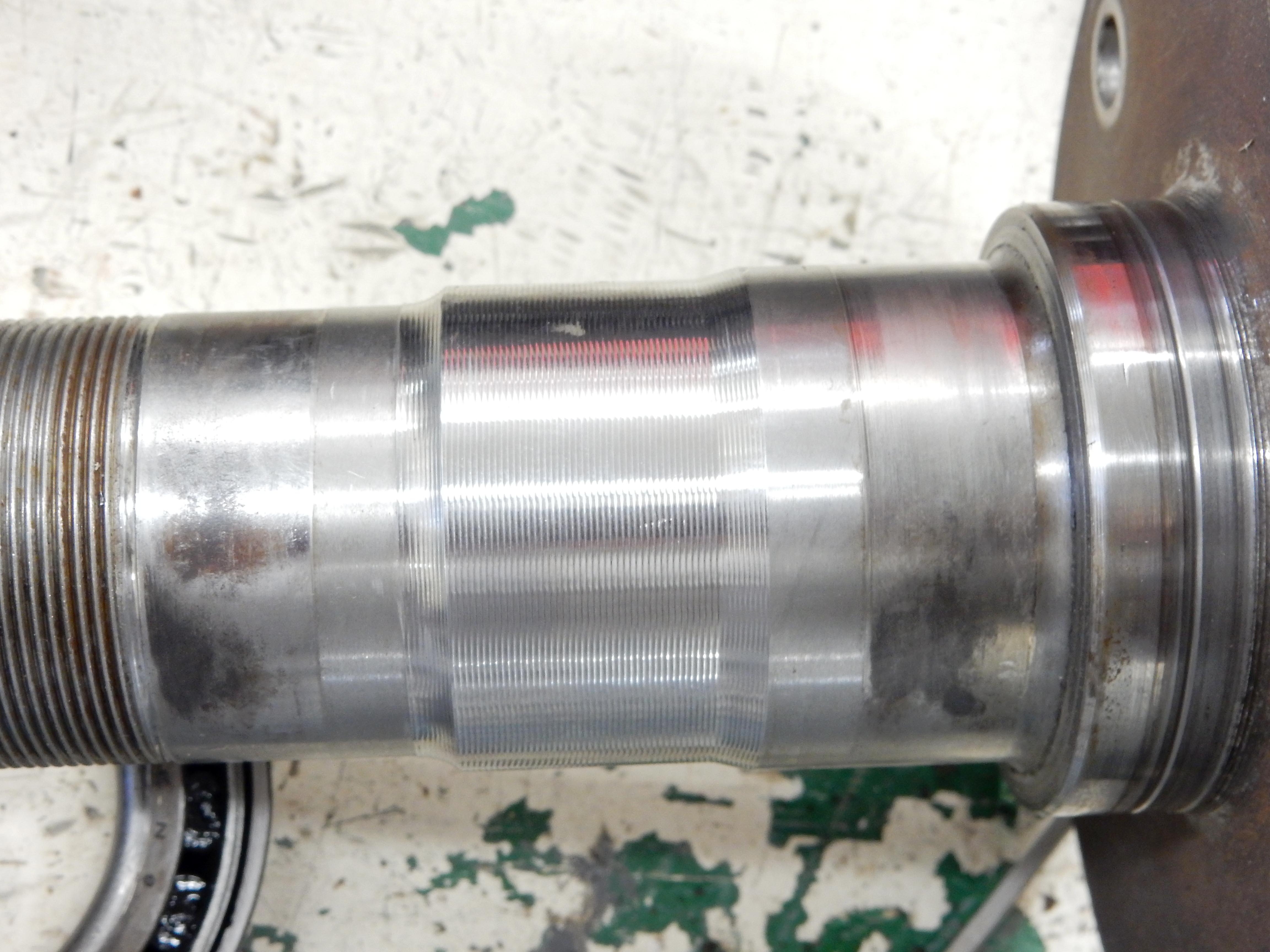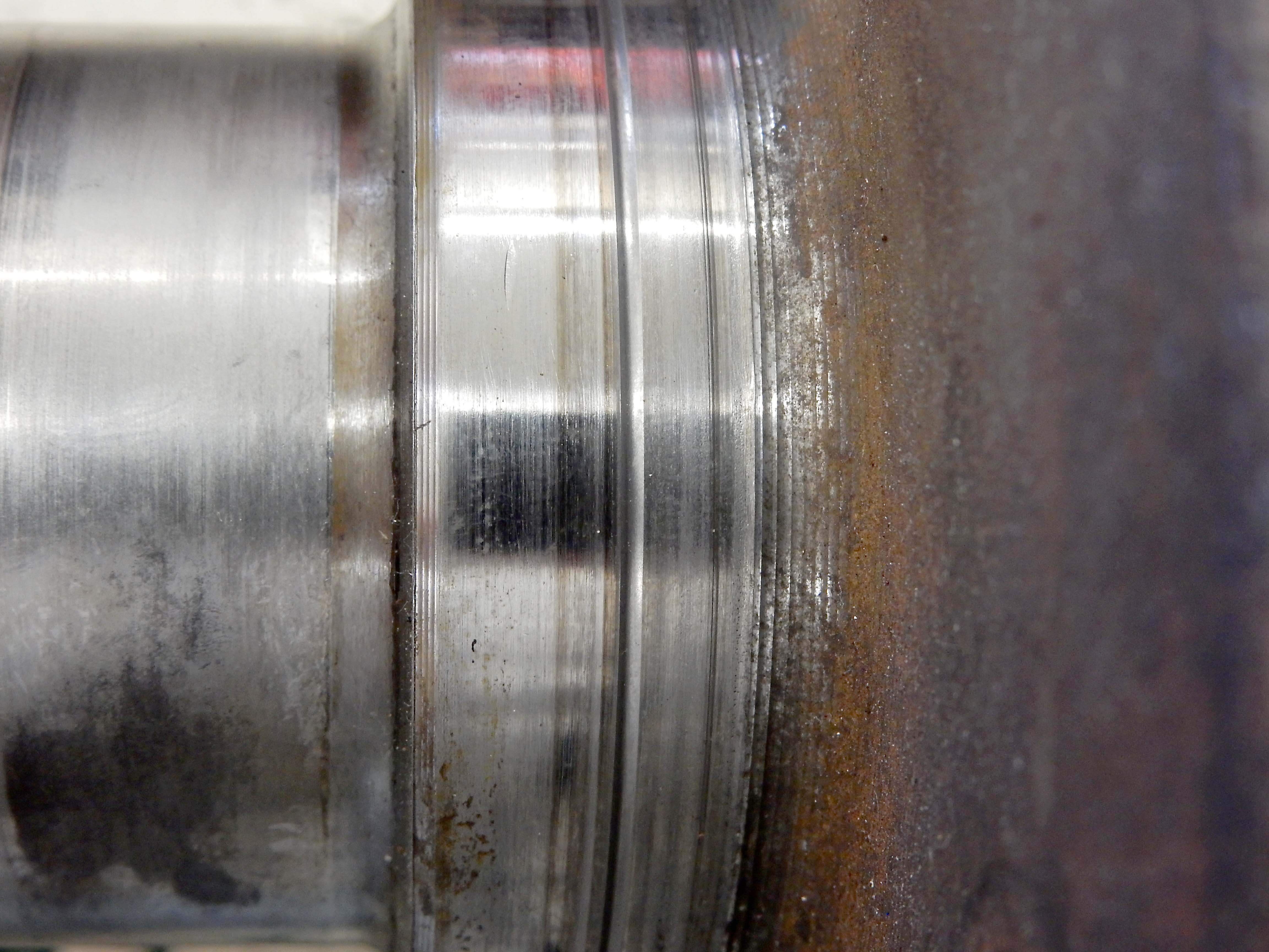 ![]() And here are a couple of shots of the spindle and its groove. Both spindles look like they have the exact same groove, so is there any possibility that it is factory? I've never seen that and can't think of a reason why they'd do that, but both measure 2.742" and the non-grooved surface measures 2.750". Surely it is just worn and needs a speedi-sleeve. ![]()