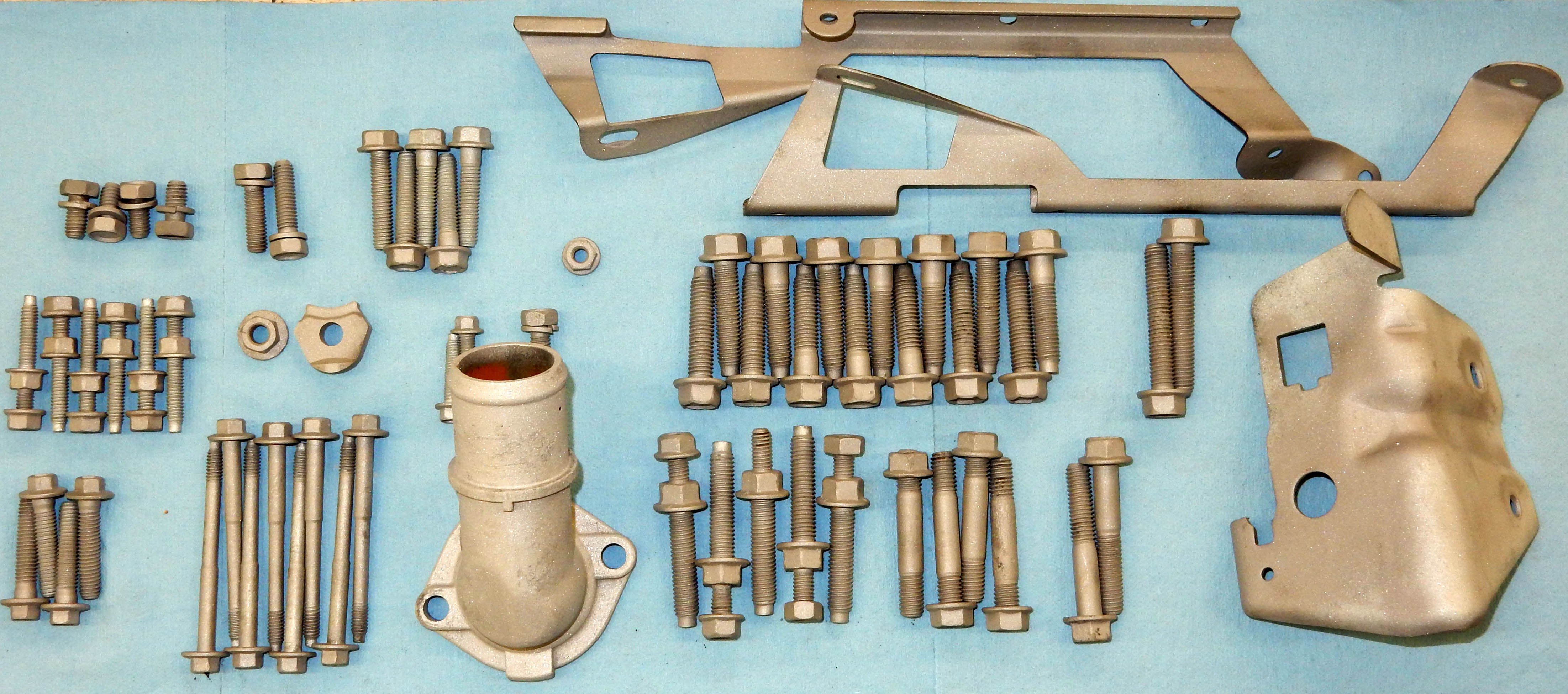Also, Scott said "I buy bulk hardware in SS for assembly." And then later "The 93+ HD water pumps use 5" bolts in several places. I will have to look Monday. I have the list written down and posted in the assembly area." And I'm pretty sure he sent me the 93+ HD water pump. So I'll get the stainless water pump bolts from him, along with the head bolts and the locating dowels. So today I plan to gather the many fasteners, and maybe some other parts, and start media blasting them. Oh yes, and I'll also blast the 2nd valve cover as I'd already done the first. Then I'll have to figure out what color to PC the valve covers, thermostat housing, and all the fasteners. Suggestions?