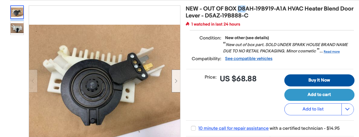 Here is the pic of what was left of my unit—no wonder I heard nothing but air suckage. The lever completey snapped. The spring was on top of the tray assembly. The unit ID (not the part ID) is EOTH-19b919 (bb). E0TZ-19b888b arrives tomorrow from Green Sales. While I got it apart, I am going to go ahead and change the blower switch too—it is stiff. Found FoMoCo part cheaper than any knock off—go figure. It will be here this weekend. I managed to find spare parts for all the plenum vacuum motors too inside and out, as well as the entire interior hoses and parts at the pick this weekend. Thank you to a 1982 F150 for the donation. So, just in case I have anything else that went bad, I am covered. See pics of my pieces, and then how it should look. Last pic is something I found just looking around. This is a replica down to the connectors and the vacuum ports. It fits mid to late 1970s Ford cars. WHY would not this work also? Could it be a swap part? Anyone know? ![]() ![]() ![]()