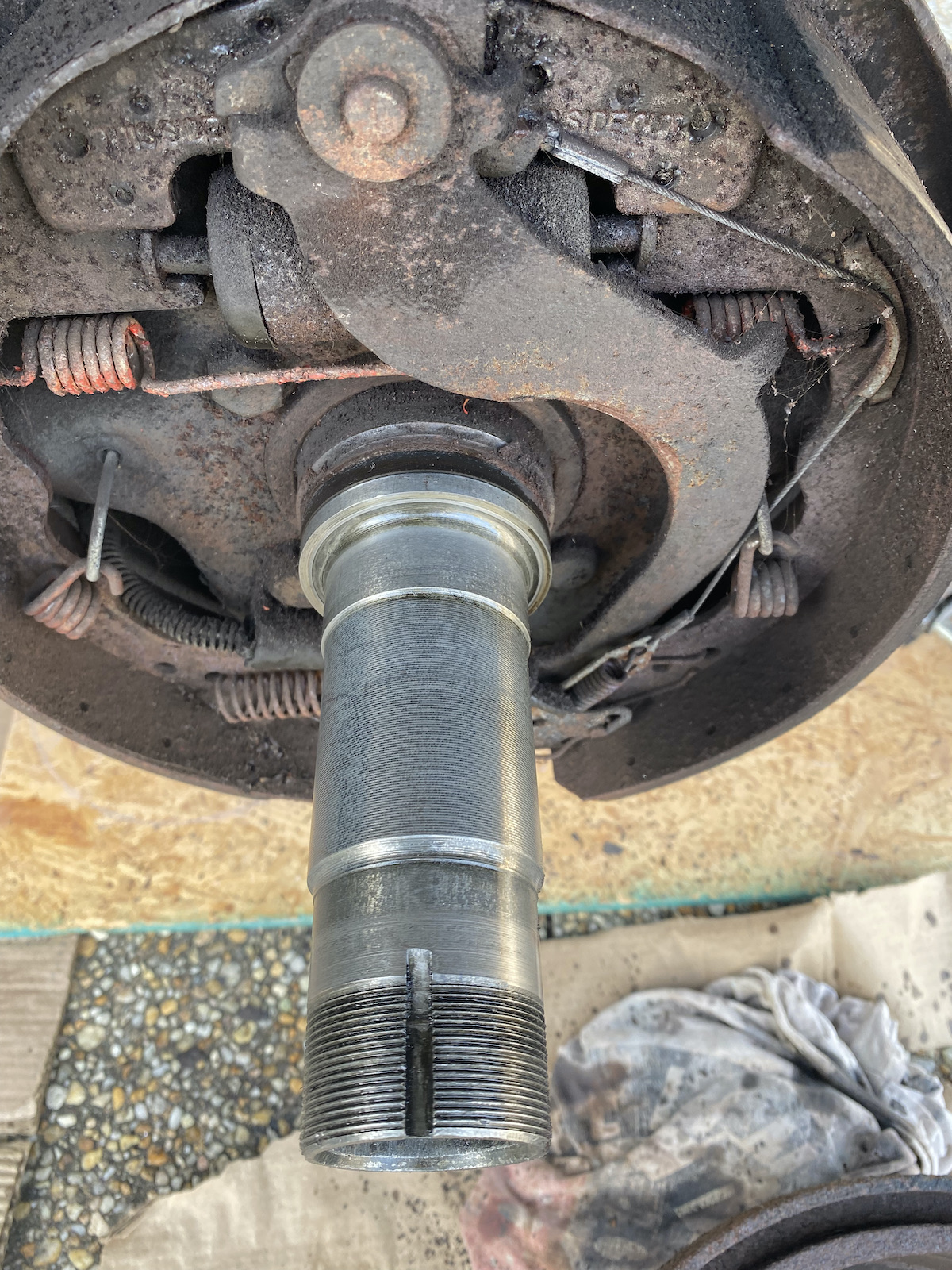 I heated the sleeve in the oven at 200, and given it was difficult to find a tube/pvc/exhaust pipe that fit right, used this reinforced cardboard tube a guy gave to me at NAPA. It worked great. The spec for this is odd to me: T to 50-80 ft lbs, then back off, and torque again to 120-140. I was expecting a 2-9/16 nut here….but instead I found this. I had the tool that I bought for my Dads 73 chevy at 16 still on me, and it worked—6 ear socket. Maybe this is better than the nut and the plastic/metal locking key? At any rate, pics: ![]() ![]()