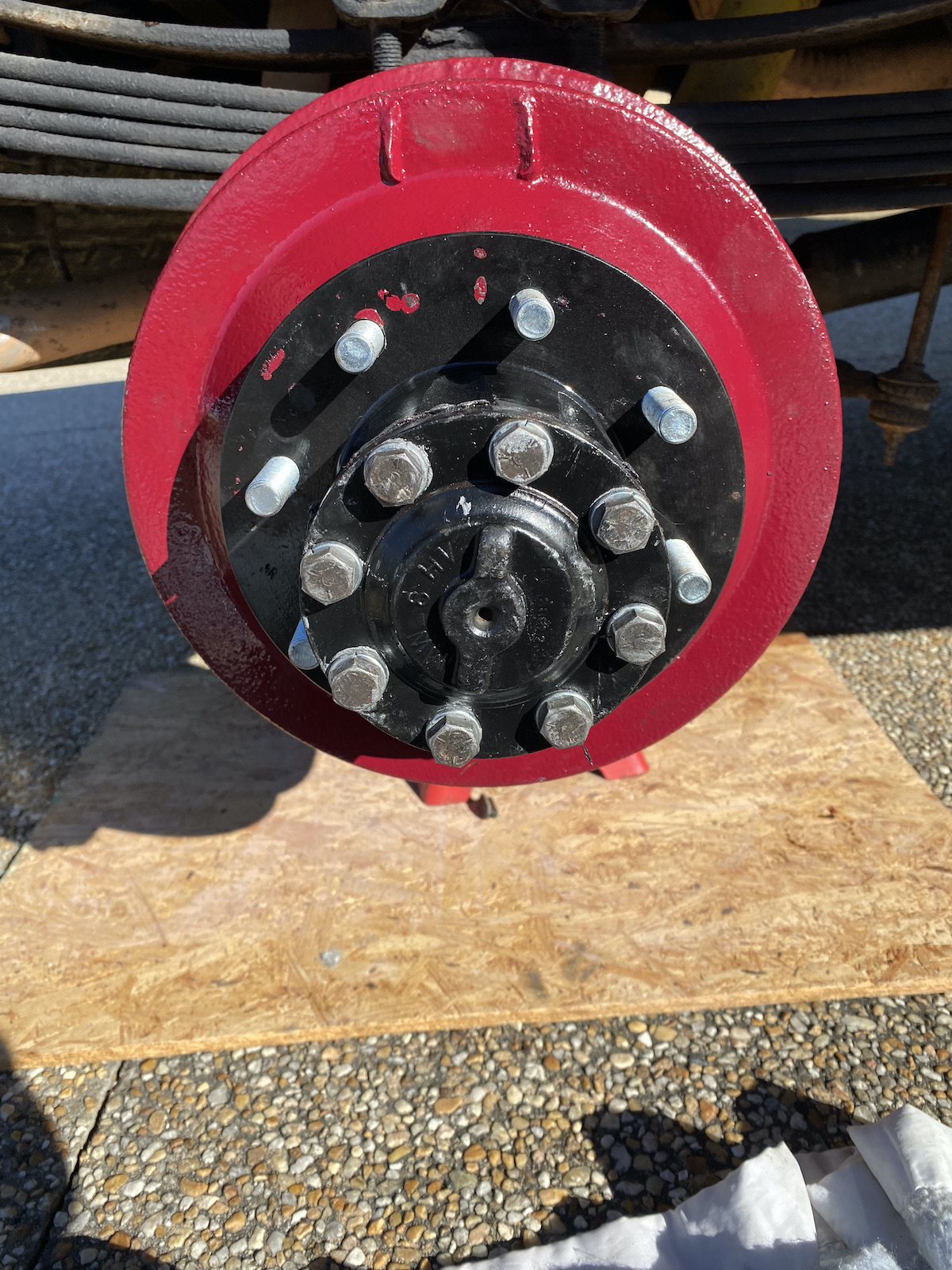 Got the new hub on today. I know, I know, I painted the drums an odd color (burgandy—matches the interior) but it was all I had around and I have no powder gun. I just wanted to clean them up. They cannot be seen really though, so, I went with it.