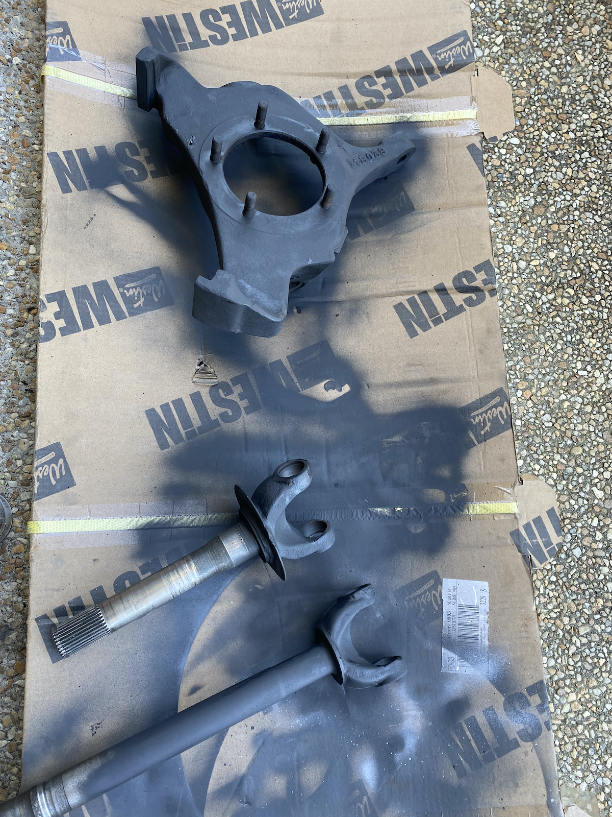 Today, got the pumpkin seal in (I added a little thin ultra black to the lip of the seal), and cleaned up all the parts—knuckle, shafts, spindle. Wired them all, and shot rust reformer, then a high temp flat (see pics). I will be taking some sand paper to the bores before install to make sure they are all cleaned out. Also I used a pick on all the snap ring guides to clean everything out.