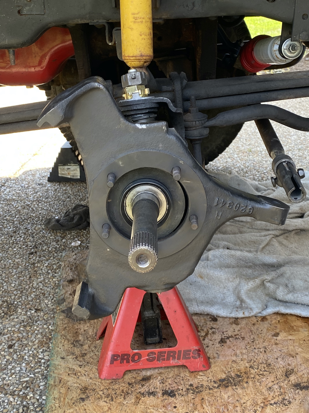 Well Gary, you were right! I set the stub shaft in, and it would not go in easy. I lubed it up with grease on the outside of the bearing, and tried again. It went in with ease. The three bolts seating it the rest of the way. Easy peasy. Thanks! ![]() One more thing: I set the speedi sleeve on the shaft to the lip. I probably should not have done that. The seal is a double lip. I BET one lip is on the shaft and the other is on the sleeve as can be seen here. The sleeve for the shaft was not as wide as for the spindle or the rear end. If I had to so it over again I would have stopped about ¼- ½ “ before the lip. Got the rest of the shaft ujoint pressed in, and the new spindle bearing and seal. Those spindle seals are loose, so I ultra black the outside of that seal and let it sit. Will not get it on until tomorrow. Want the ultra black to set up. But, the knuckle and shaft are all in! Moog camber/caster installed and spec'd to the same as D side. ![]()
