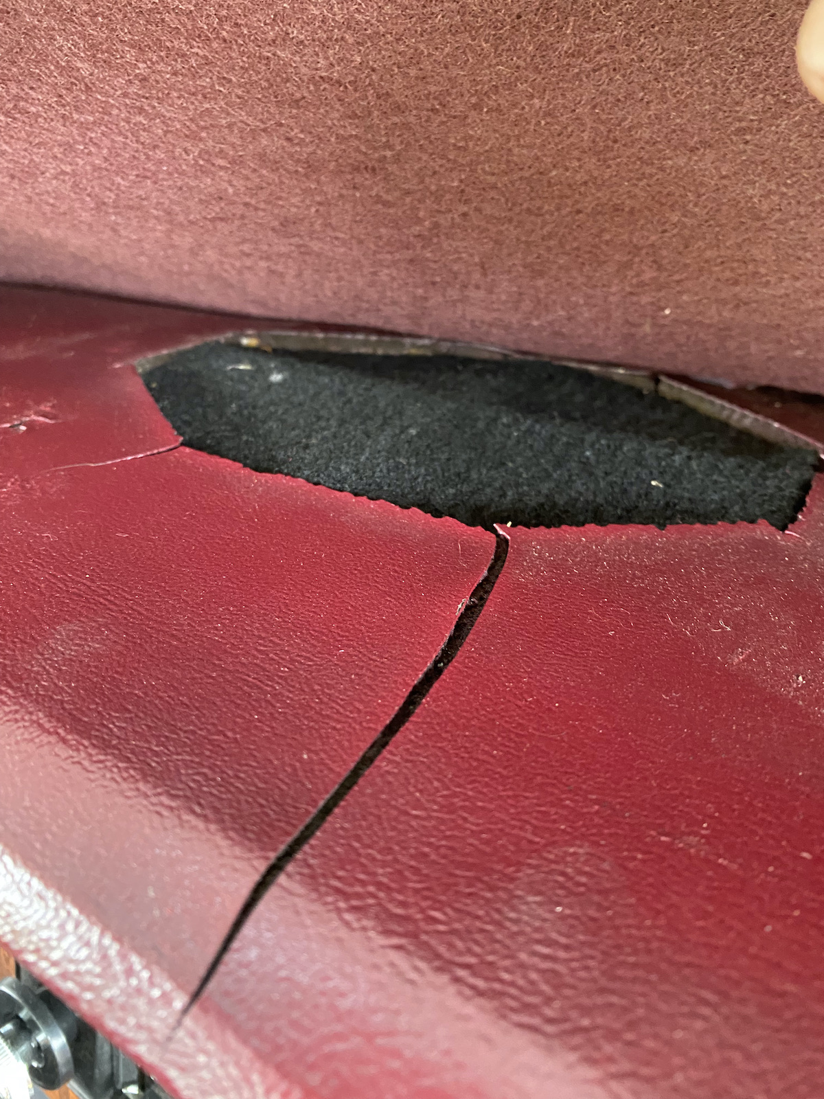 I have been shopping for paint and prep system needed for this project, including texture and primer for the repair. I have settled on SEM for it all. The question is what filler? Of course it could also be wrapped, but I am not going to do that. As you can see from the pic, I have two small cracks, and the rest is fairly decent shape. So, there are options. 1) bondo—however, when bondo dries it cracks—this is not good for cold. When it heats up I am unsure if it allows flexibility. 2) polyvance: this requires welding in plastic and then filling with their dash bondo which is flexible in all conditions. 3) combo short hair bondo/Polyvance filler. I will go with 2 or 3. Option 2 requires use of their plastic iron system which is $100. 3 is the cheapest, but I do not know if the underlay short glass will be enough flexibility. So longevity might be an issue. So I am undecided. Then I have the grille problem. I am not sure how to solve this issue absent Reamer. But I am looking. In the process I will be doing all the interior plastic sanding and using minimal filler for one platic piece behind the seat as it cracked. Fiberglass and resin will be used to reinforce, then small filler. While I am here I am also going to test that temp gaugue that is broken. Or the dash printed circuit. I need to lookup how to test these gauges. I believe you can from the battery, one post to the hot and one to ground????? Then the seat and the headliner. I am set on what I am going to get. Full cloth. Probably get the foam repair kit from LMC just in case I need it.