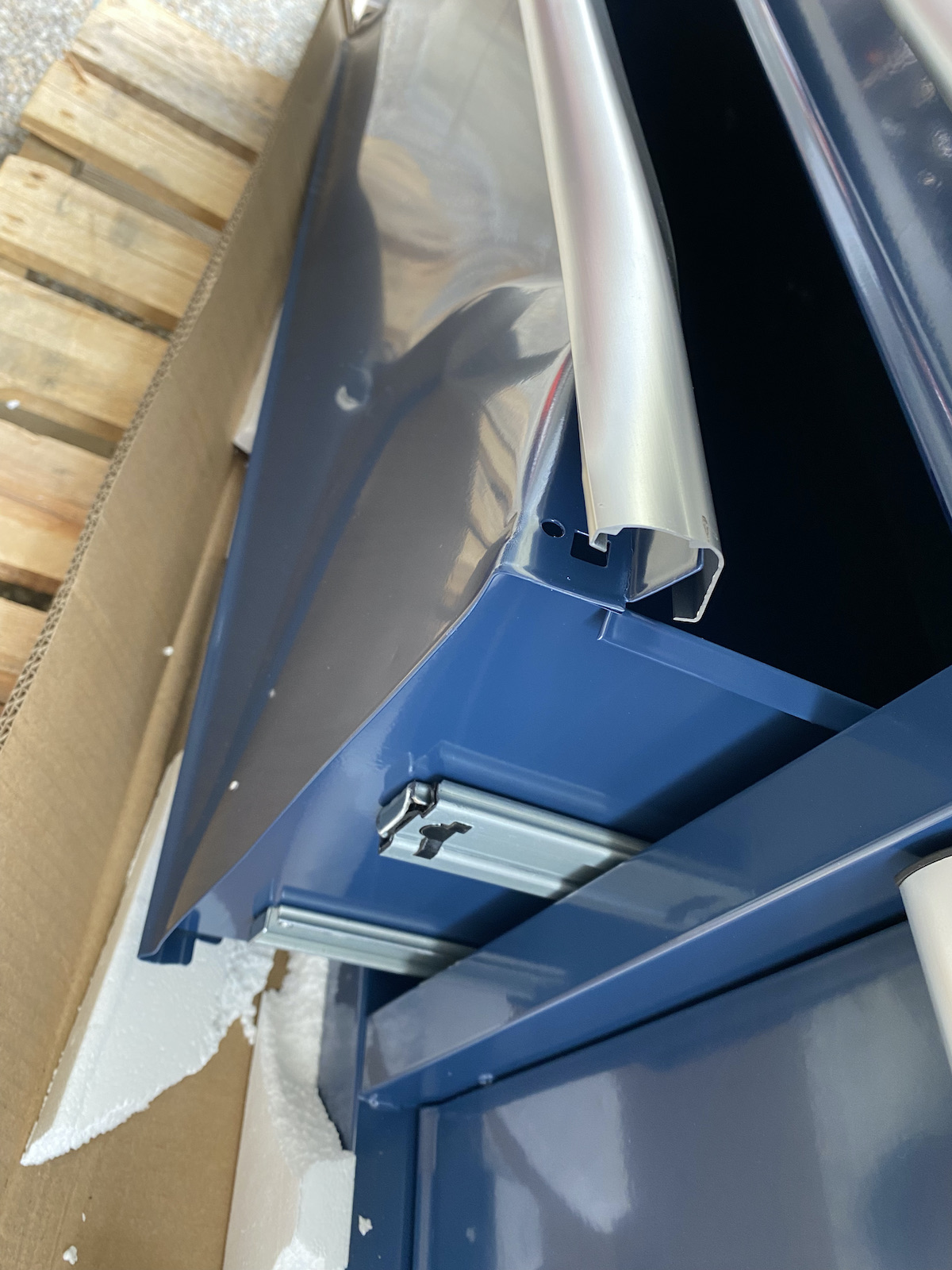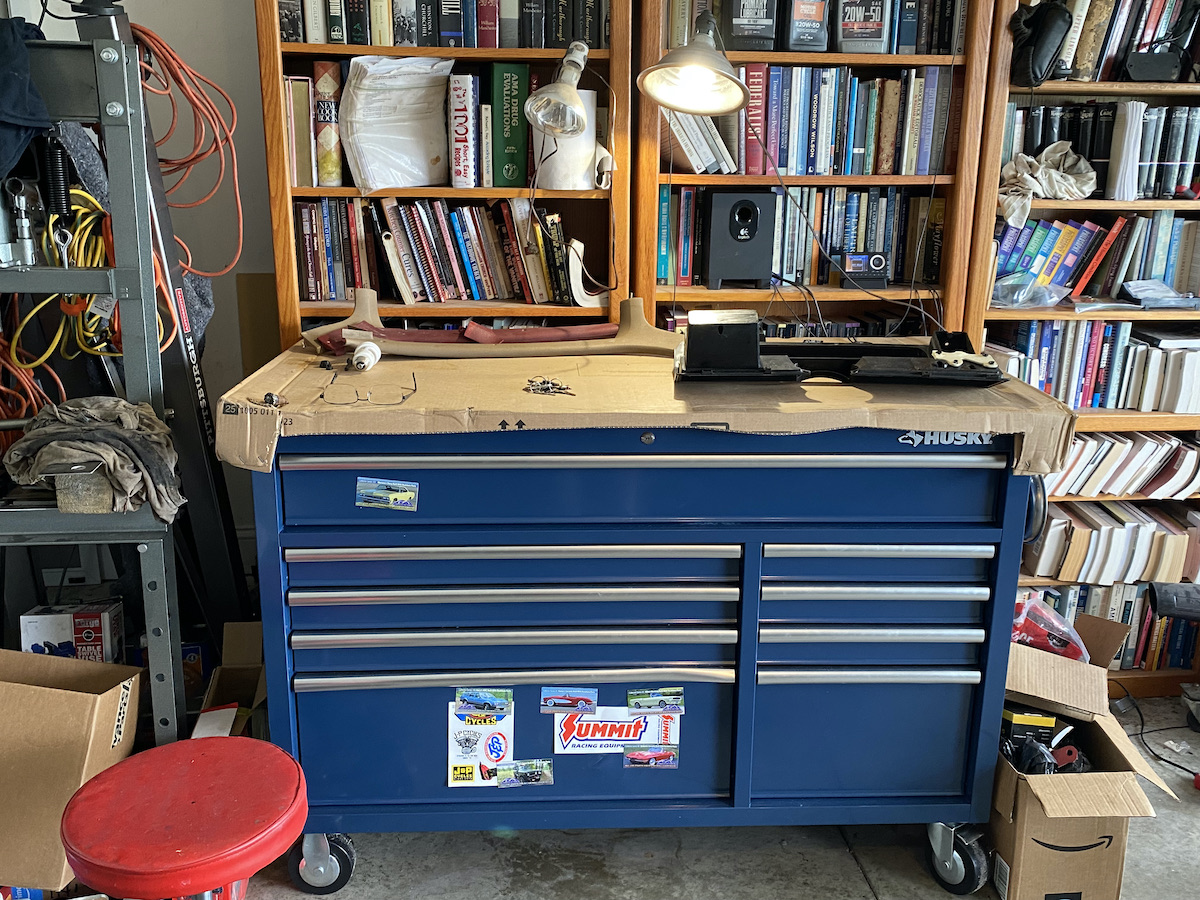 While I am waiting on a few things—the Lokweld is on the way, and the dash cluster is stuck in San Jose…went to the bog box to grab some chemicals and chip brushes, tape off paper, etc. Saw a 52” x 24 workbench. I have no table in my small garage—only my 1980 triple stack Craftsman tool box. Over the last 2 years, I have accumulated a lot of tools. The box was overflowing into a makeshift dresser. Anyway, saw this—it was 598 on sale from 698. They had two and at the store is was on fire for 398. I had one of those 12 month no interest coupons and snagged it. I want a bench to rework the bench seat upholstery. It arrived, and when I unwrapped it…UGH. Huge ding. Something heavy slammed into the box. I called for a pickup and redrop. Kinda wanted it pristine. But then I pushed some of the dent back and got the silver handle nearly realigned. Offered them to keep it for 200. So, walla! Got it for 198. Despite the still visible ding (covered by my Summit sticker held on by magnets), not a bad deal I would say. It is not perfect, but it works in my tight space. Pics are the original ding, and then the placement after fixing most of it. Might do more fixing/rivet a couple sections. ![]() ![]() ![]()
