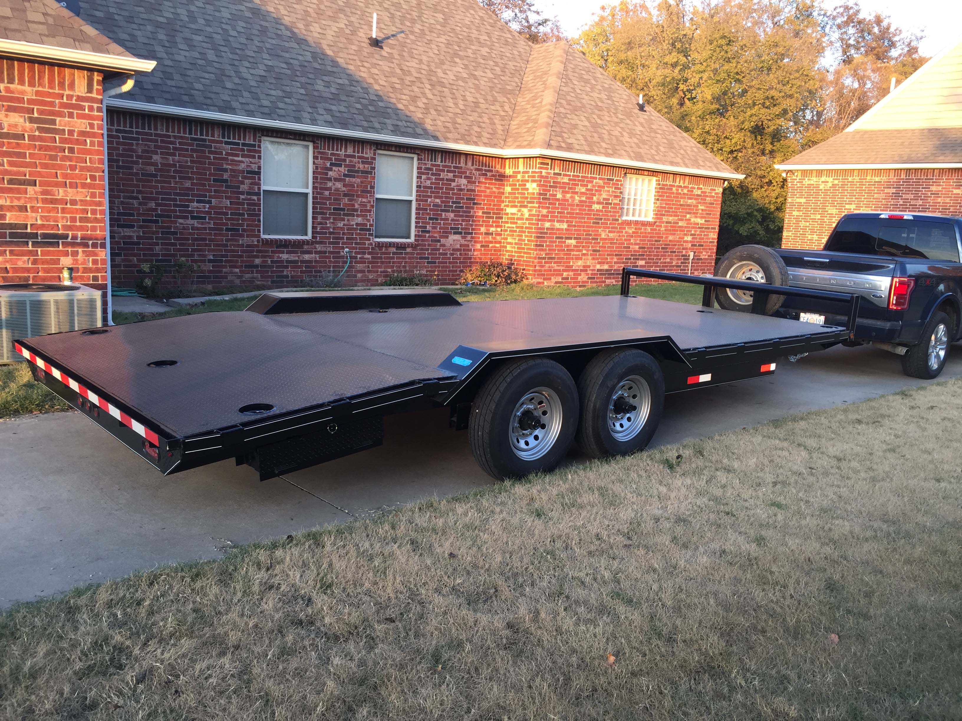 First a link to some pictures of my trailer so you can see what works for me. cars.grantskingdom.com/var/resizes/70-Javelin-Racecar/b_roken0051.jpg cars.grantskingdom.com/var/resizes/70-Javelin-Racecar/b_roken0045.jpg cars.grantskingdom.com/var/resizes/Durango/GAD_V_Rig1.jpg I never worried about 1 axle caring more load than the other and never had any issues. I have had full size Blazers and a Chevy van on it with on issues. I don't like dove tail trailers as the rear of the trailer is now closer to the ground so it can hit going in or out of driveways. Now that may not be bad if going forward but what if trying to back into a driveway and it digs in? My ramps are long so that helps getting things on/off the trailer. If the hump is too much, low sitting car, at the top of the ramps I can jack up the front of the trailer. Put a tool box on the trailer! After moving the tie downs, chains, etc. from truck to truck it gets old fast. Who said it has to be above the "A" frame? It could be mounted so the top of the box is even with the top rails for the "A" Fenders, some trailers you can remove them by pulling 2 pins, 1 front & 1 rear. My fenders do not remove but are strong enough to drive on if I had to. I do have a crease in one where the tire fell off the fender and the wheel/rim hit the fender. Drive over makes the deck higher and that puts the load CG higher, think handling. How long is big blue? Would a 24' deck be better so you have more room to move what ever to balance the load. Also with a longer bed what ever you have on it would not hang off the back as much. With the pictures of my drag car it does hang off the back some but never had anyone hit it. You would also have room to put parts on the unused deck. See the rear axle in front of my drag car on the deck? As for color black or white, maybe even silver goes with everything. Now you said black would not be seen if it "drove off". If the trailer is parked in a storage lot then maybe it will go missing? Mine have been parked in my drive (CT) or by my garage (NC) far off the road and never had any issues with anyone "looking it over". Lock the hitch and they make locking wedges for the wheels. I also never had anyone "almost" hit my shorter 1 car trailers (a blue and the black one above) but many times "almost" hit the long YELLOW 2 car trailer. People just don't look! Because my trailers were open decks I could use any of the trailers cross members to strap the load down to. But the above trailer does have 2 rings off the back CM and 1 up front. Winch and how to wire it? 2 speed hand winch works just fine for me for the few times I needed it. The cable does hit the last 2 or so cross members but so what, it's not going to hurt it, just watch the hook clears them. If I ever "up grade" it will be a 24' enclosed trailer so I have another "garage & storage". Dave ----