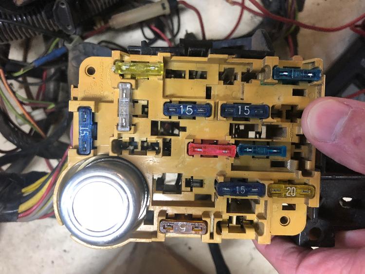 But everyone agrees that the courtesy lights are served by a light green/yellow wire. And here's the front of an '82 fuse box I have in the attic, with my thumb at the #8 position, and #7 is directly left of that, as shown