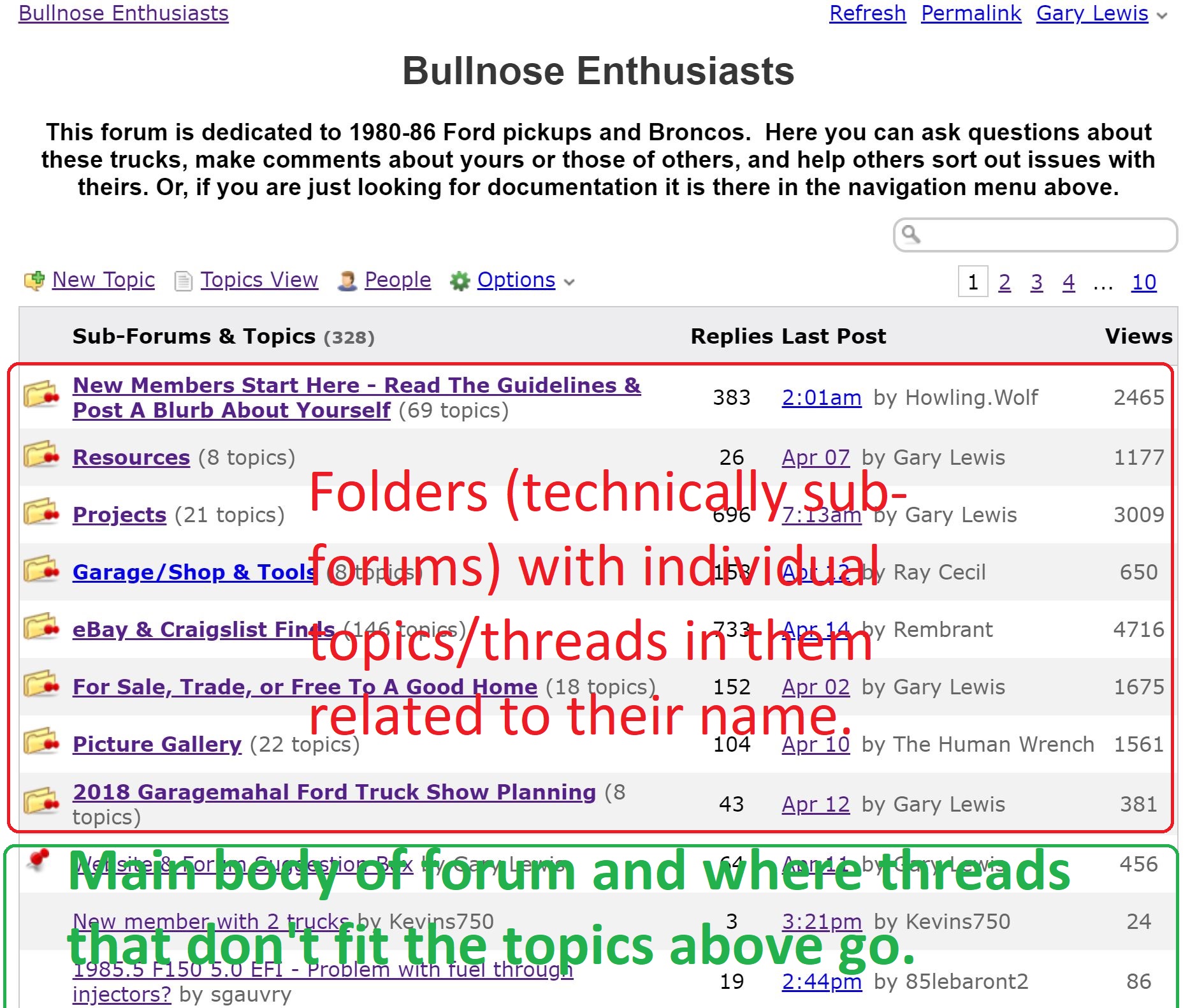 So, tell me more about the problems finding things? I consider the view below the main page. And you can get to it by clicking the Gary's Garagemahal that pops into view when you scroll up or down. So, let's assume I put this thread into the New Members Start Here folder shown below. To get to it click that folder's name and you'll see the threads/topics the other new members have started, with the newest at the top. You can click on any of them to read them, and when you want to go back you can go to the top and either click on the New Members Start Here link in the center, or click on the Bullnose Enthusiasts link to the left. Does that help?