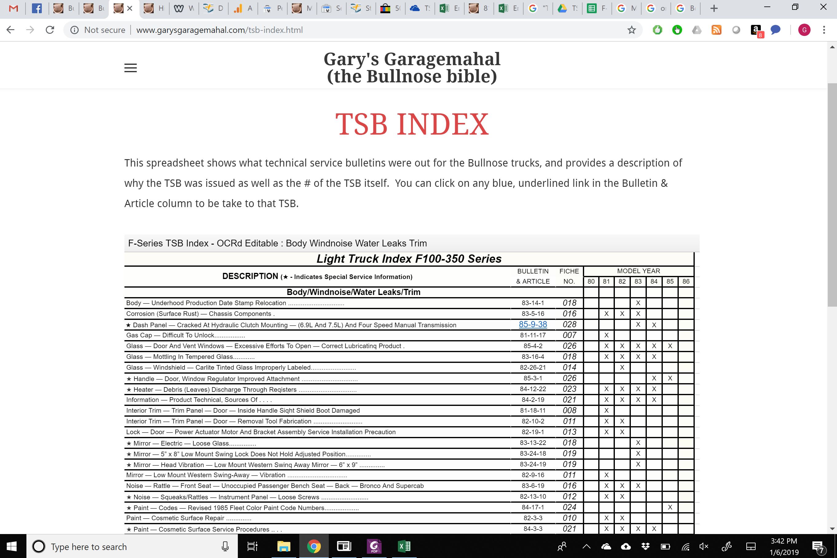 Spreadsheet: The TSB index spreadsheet is "done", meaning that there are about 800 entries in it that represent the bulk of the TSB's that apply to the Bullnose trucks. However, it'll never be truly done as we will be scanning in lots and lots of TSB's over the next several months (years?). And each time we get a "new" TSB then I have to create a link from the spreadsheet to it. Organization: There are now sub-headings in the website menu that match the 9 different categories into which Ford lumps the TSB's - as seen in the spreadsheet. TSB's: We currently have 26 TSB's sorted into those categories and linked to from the spreadsheet. Doesn't seem like many when you realize there really are probably about 1000. But, we needed the infrastructure into which the "new" TSB's will be sorted/added/linked, and I think we are "there" - for the most part. TSB Names: Here's where I need the HELP!. We currently have two different naming methods. Here are examples of them: 83-3-15 Pickup Box AlignmentTool Box MountSo we need to figure out which of those we want to use - before we go any further. Why you might ask? Because the name I give the TSB becomes part of the URL. So any change will also have to be changed in the index spreadsheet. Further, unless I do a re-direct in Weebly then any links people have saved to the old URL are no longer any good and will return a 404 error. In reality it doesn't matter too much. But the TSB # really doesn't do anyone any good - unless they are searching for that specific TSB #. However, I can get around that by placing the # in the keywords part of the page, as well as in the header, so it can be found that way. And, speaking of finding things in a search, we still can't find that one page that I made "public". But, our 4 weeks aren't up yet, so there's still time. And, using the keywords on each web page I can help Google find the page, if not really the document. But, if they come to the page then they'll see the document. Anyway, my preference is to take out the TSB #, but maybe I'm missing something?