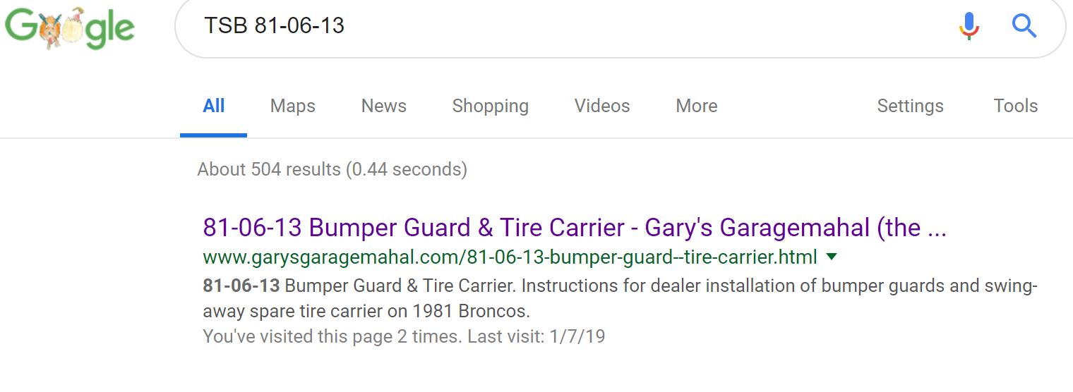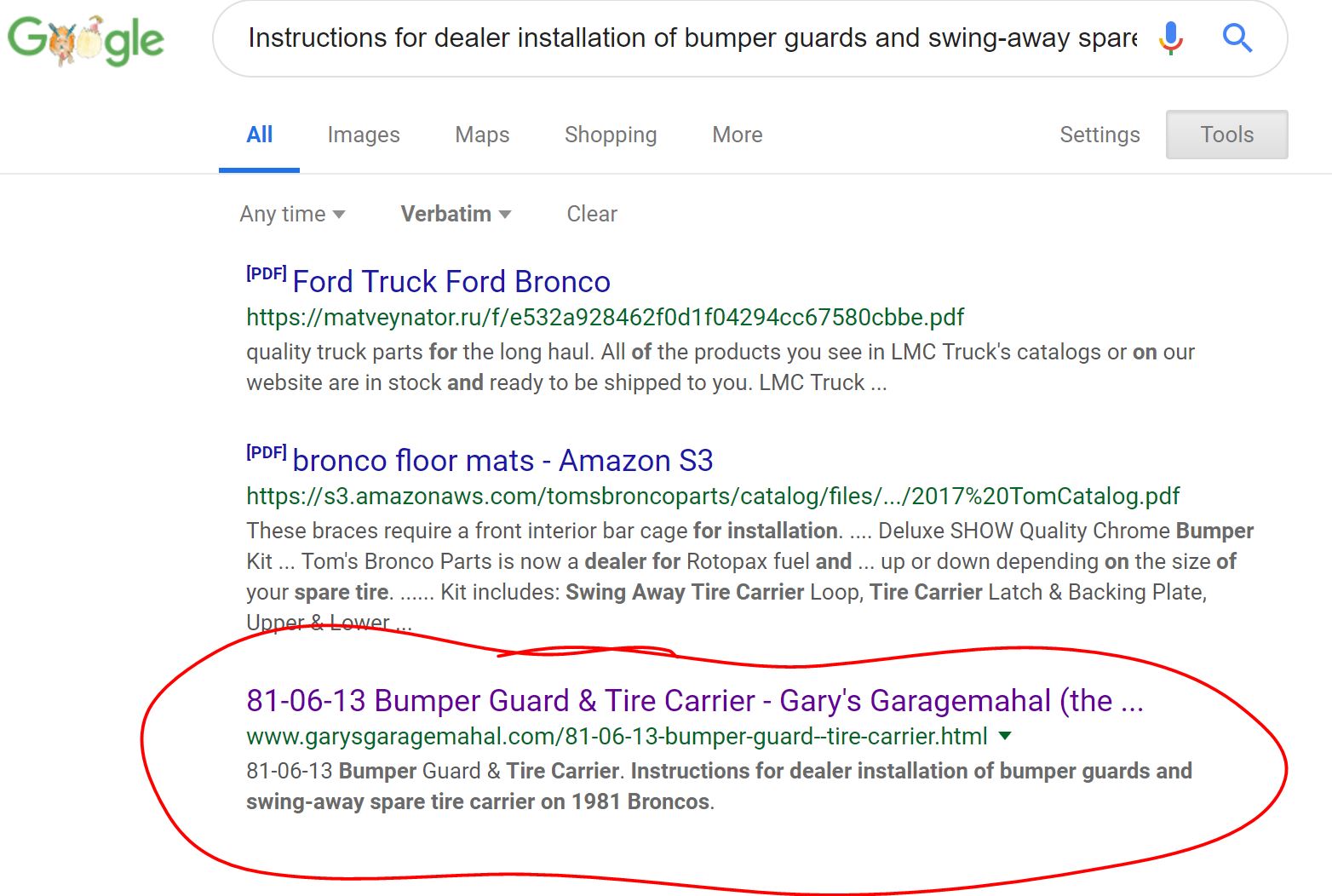 And, here's the results of a morning-after search for the phrase that is included on the bumper guard and tire carrier TSB, which is "Instructions for dealer installation of bumper guards and swing-away spare tire carrier on 1981 Broncos."