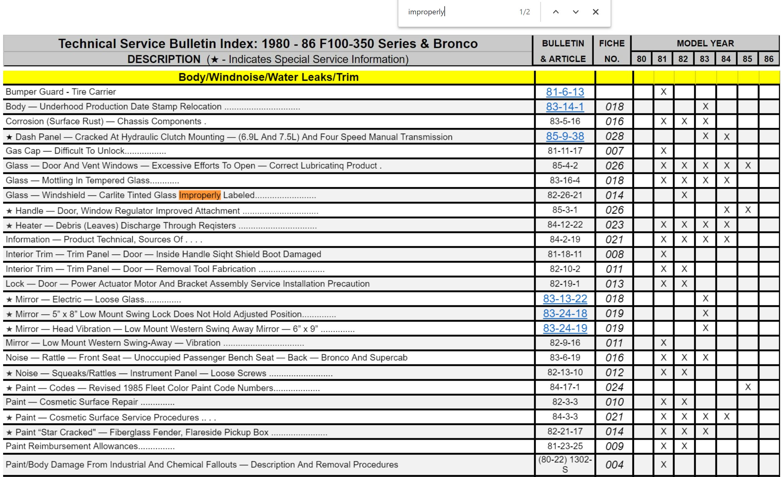 And we sorta have the "page with a search menu (similar to BBB's) above a long list of TSB links in numerical order with titles & descriptions" in the form of the index spreadsheet. However, it doesn't have the TSB's in numerical order. Instead it has them in alpha order within each of Ford's 9 categories. And, we have the search function. In the example below, which is the first 26 entries in the index spreadsheet, I've hit Control-F and brought up the search function within the browser - just like the instructions at the top of the page say. And I've typed in the word "improperly" and the computer says there are 2 instances of that word in the index, and it has highlighted the first instance in orange. Plus, you can cycle to them with the up/down arrows. (And if you type in "transmission" it'll currently find 136 instances of that, although as we add TSB's that aren't yet in the index that count will go up.) So here's what I propose: We hide all TSB pages but the index spreadsheet from the menu. So when you hit TSB's in the menu you'll find the index and can search for what you need, like a key word in the description or the TSB # if you know that. Does that work?