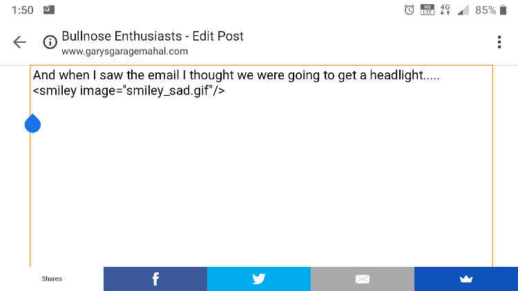 Jim - Is this still the status on your Android when replying? I'm trying to work the issue and need to understand what the problems are for sure. As I understand it, the issues are: 1. The "Gary's Garage (The Bullnose bible)" header blocks part of the window on your Android. Right? On my iPhone if I scroll up on the screen it goes away, but if I scroll down it comes back.2. The text won't wrap in portrait.3. You can't scroll sideways.And, have you tried the other browsers? Just wanting to get all the issues associated with the reply window on a mobile device nailed down before I work on it.