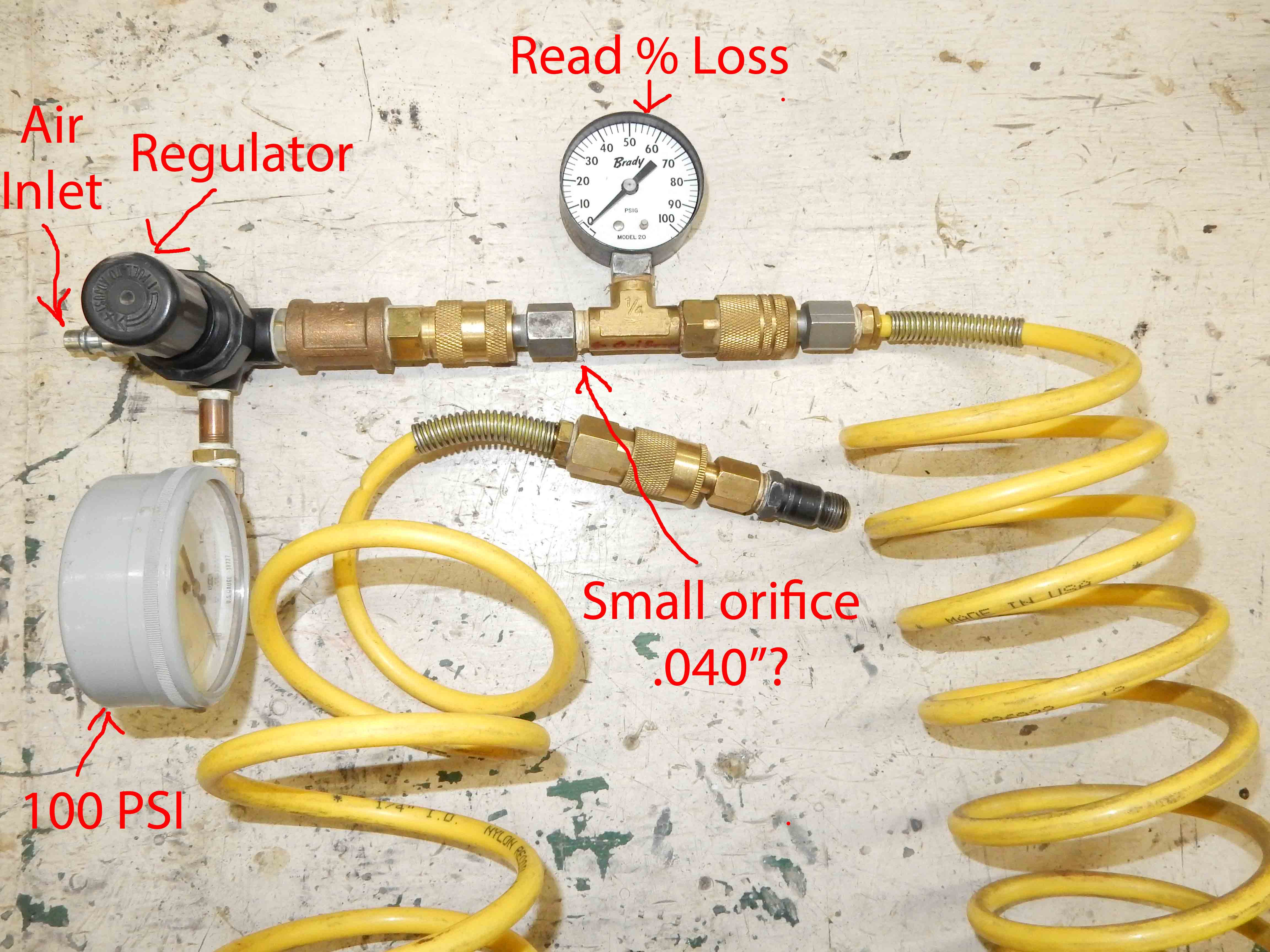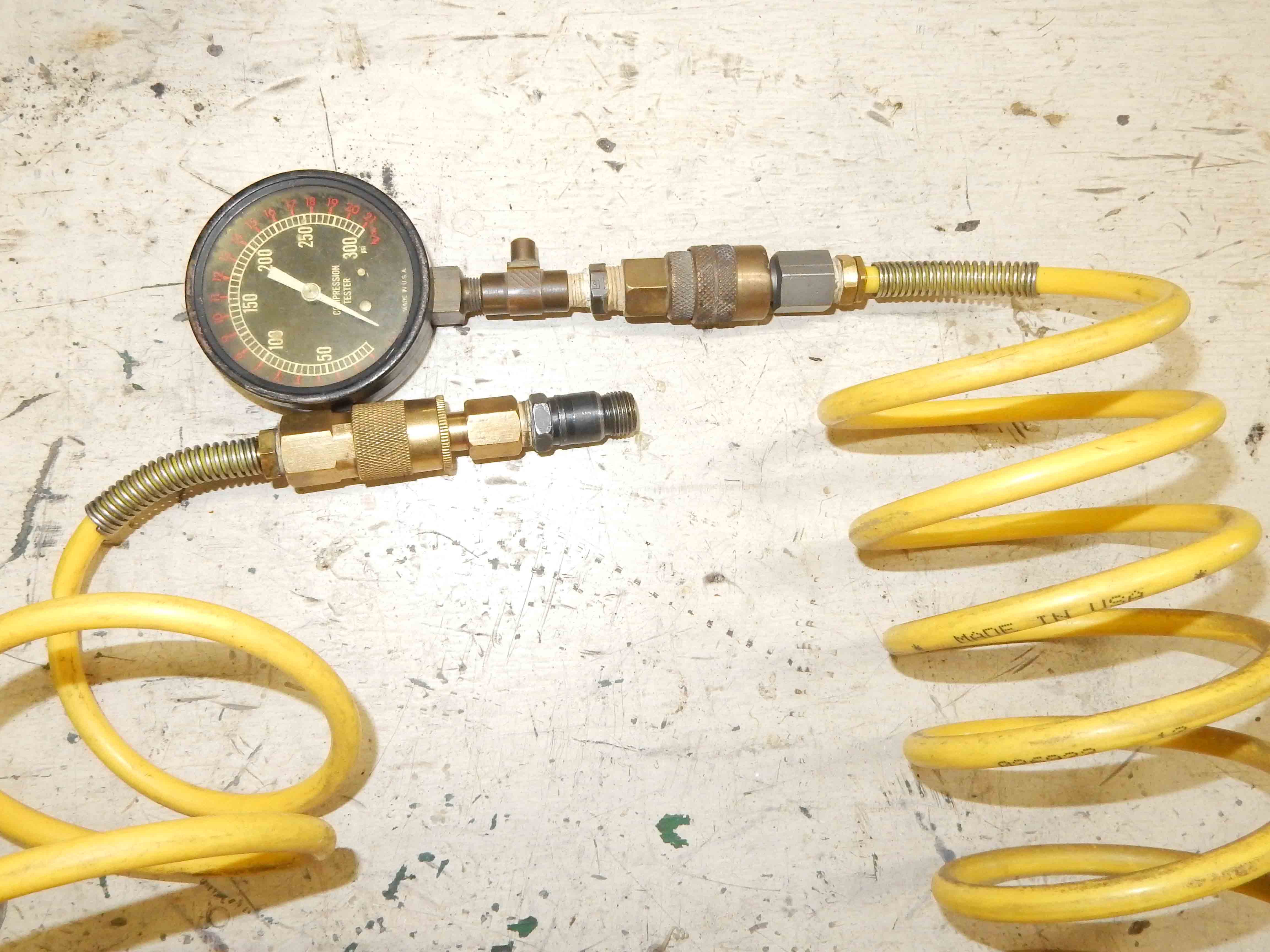 ![]() Here's what's in the box. Configured as on the left it is a leak-down tester and you supply air on the upper left and put the spark plug in the cylinder being tested when it is at TDC on the compression stroke. Dial the regulator around to read 100 PSI on the left gauge. BUT, the loss is actually 100 - right gauge. And configured as on the right you have a compression tester. I'm not a big fan of testing that way, but it is available nonetheless. ![]()